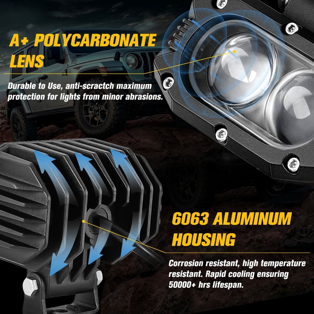 ....【高性能】:IP68防護レベル,有効的な防水素材を採用し、どんな悪天候でもご心配なく対応できる。防塵.耐衝撃 アルミ基板なので、高温にも耐えられる非常に優れた耐熱性・放熱性を実現。ライトの角度調整が可能で、より便利に使えます。-オフロード車のライト、ワークライトバーに最適。