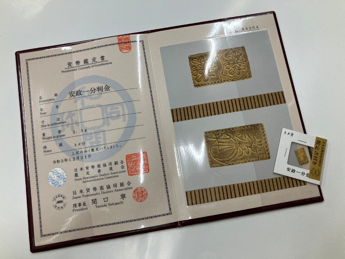 Product name: (1-17921) 安政 一分 判金 鑑定書 付 一分金 貨幣商 協同組合 古銭 江戸時代 古金銀 貨幣 日本 【緑和堂】