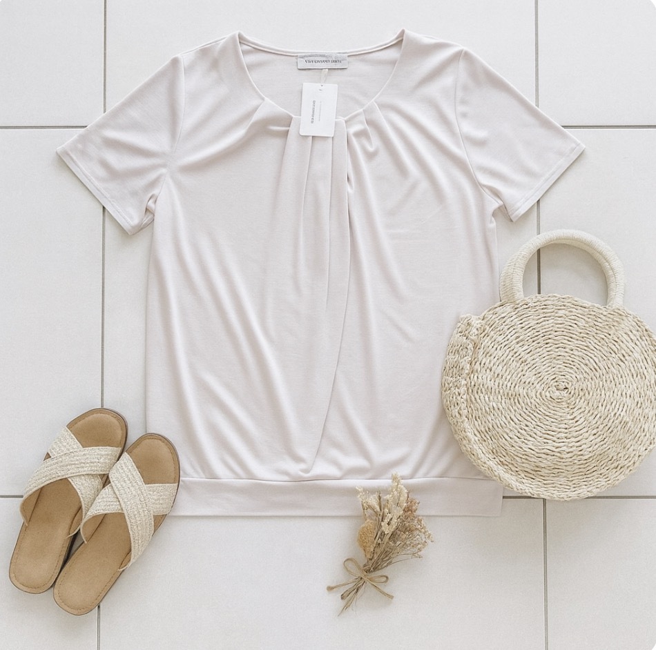ドロスト&ギャザー入りのシルエットが大人フェミニンな印象。