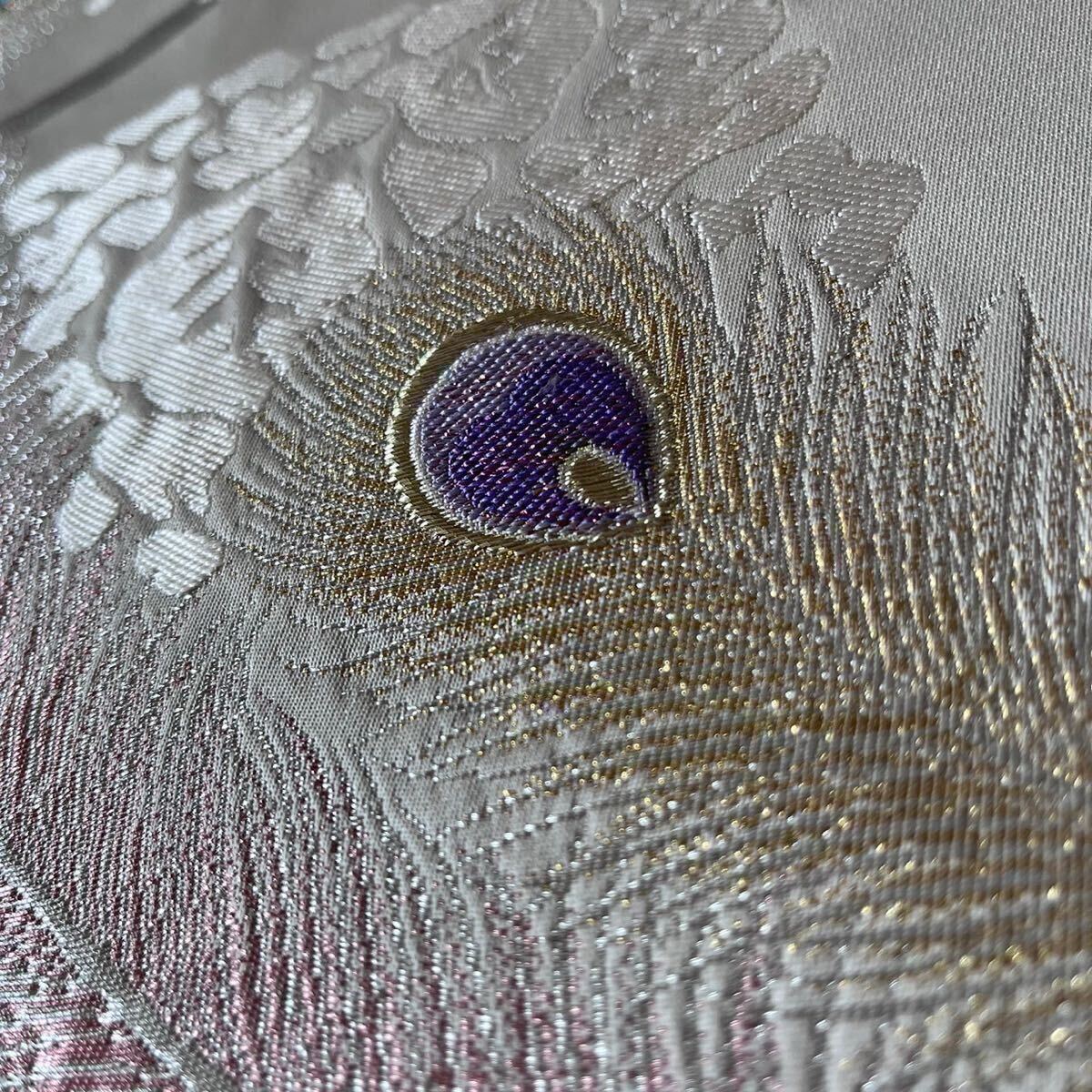 振袖袖用の袋帯です。白地に銀糸の亀甲X美しい孔雀の羽の織り出された六通がらです。