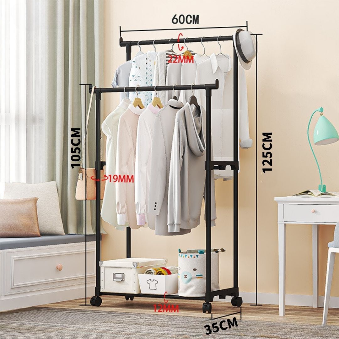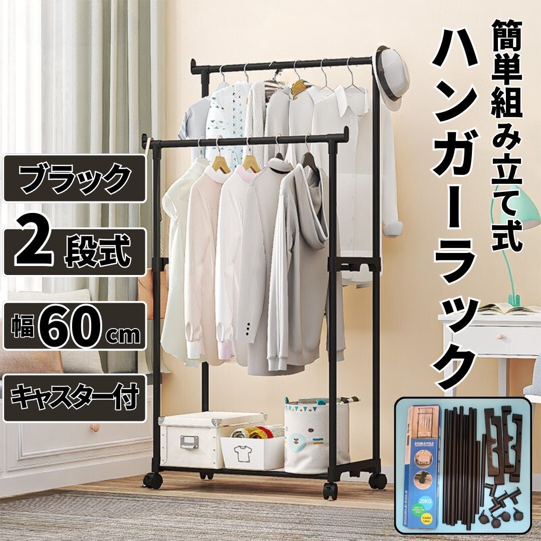 ハンガーラック 2段 ブラック黒 キャスター付 ダブル スチール 簡単組立式 パイプ 衣装干し 部屋干し 収納 スリムタイプ 洗濯物 軽量 クローゼット 幅60cm 衣類