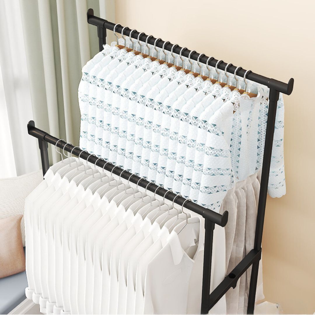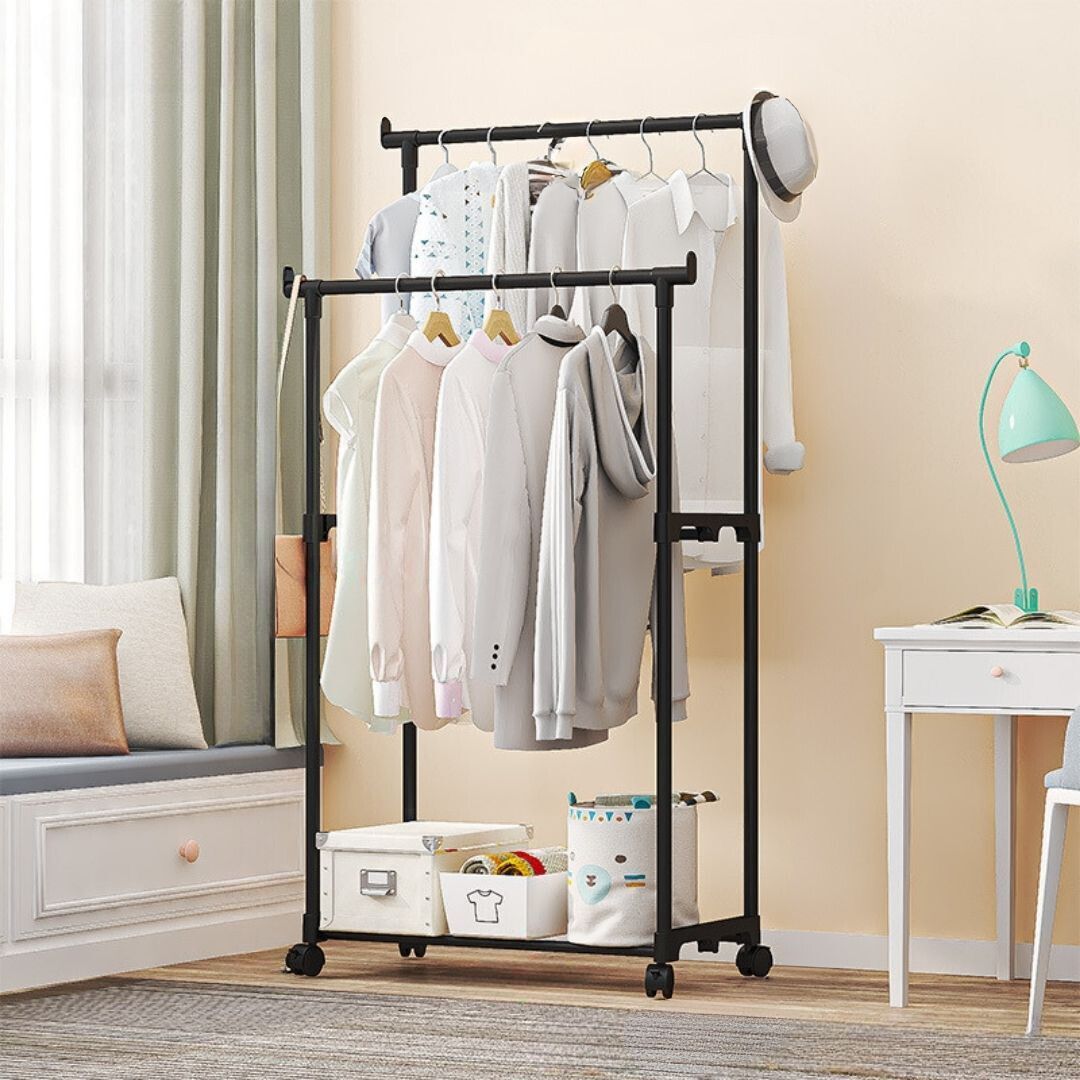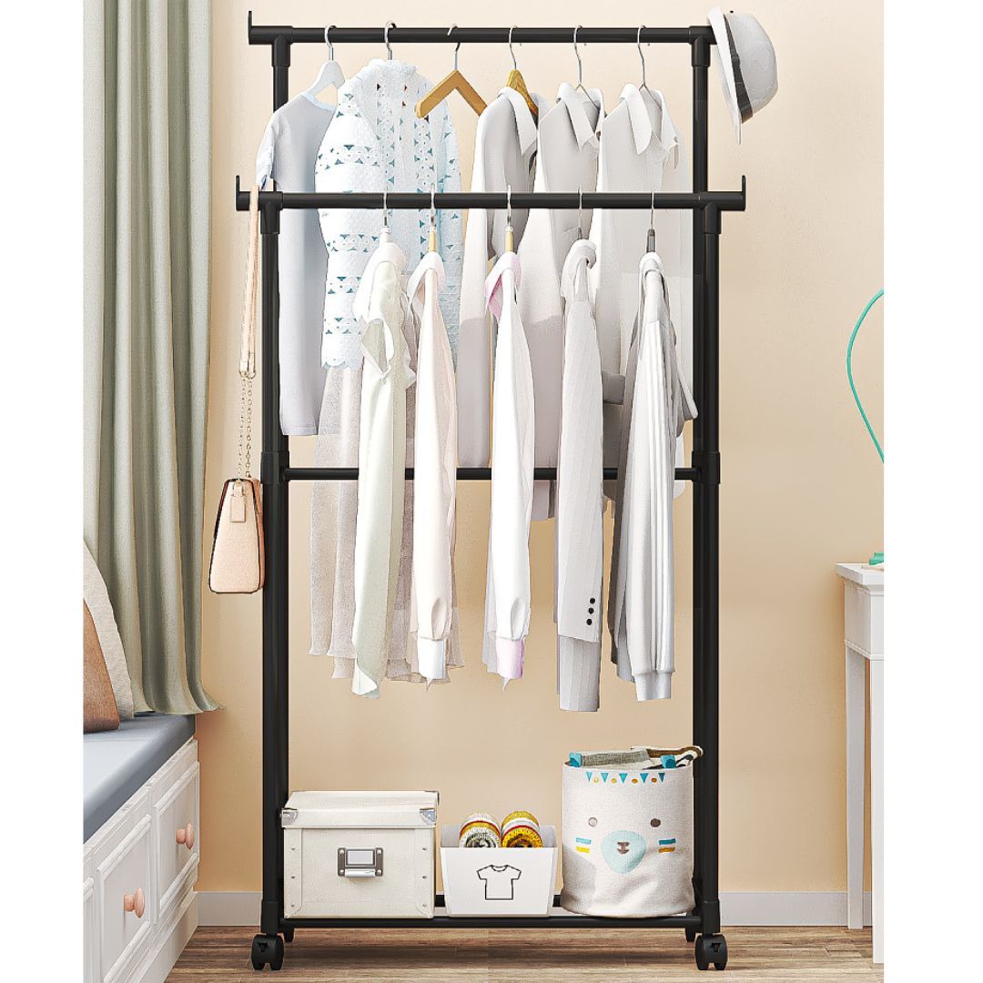ハンガーラック 2段 ブラック黒 キャスター付 ダブル スチール 簡単組立式 パイプ 衣装干し 部屋干し 収納 スリム洗濯物 軽量 クローゼット