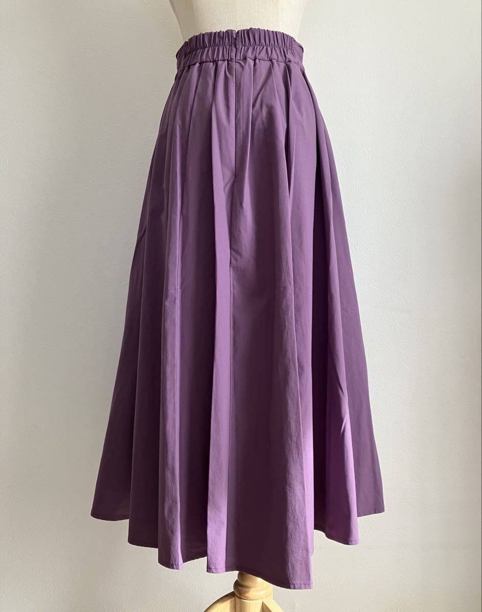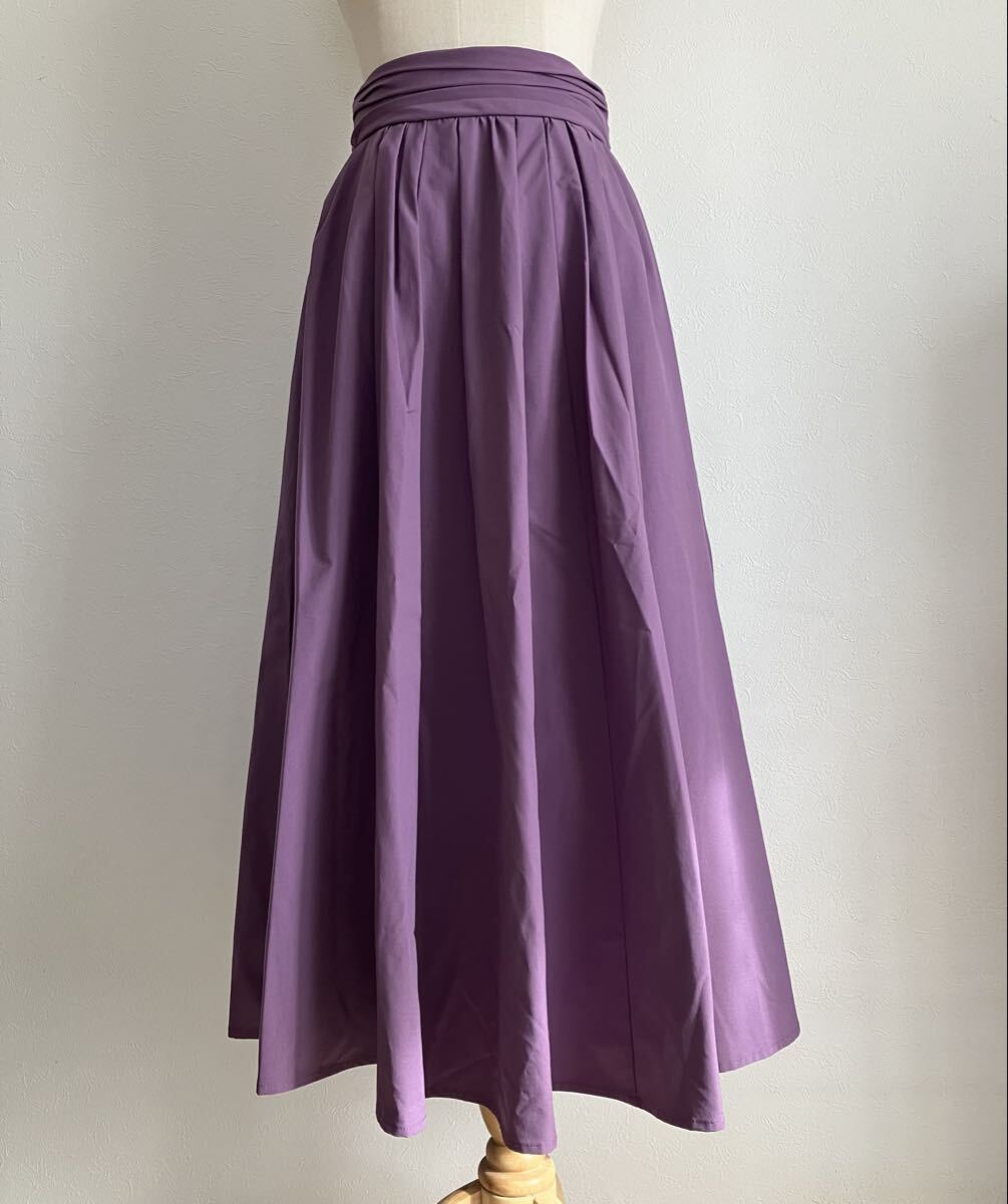 軽やかなパープルのフレアロングスカート、Mサイズ、ポリエステル100%。オールシーズン着用できます。ウエストは後ろがゴムなので、楽だと思います。