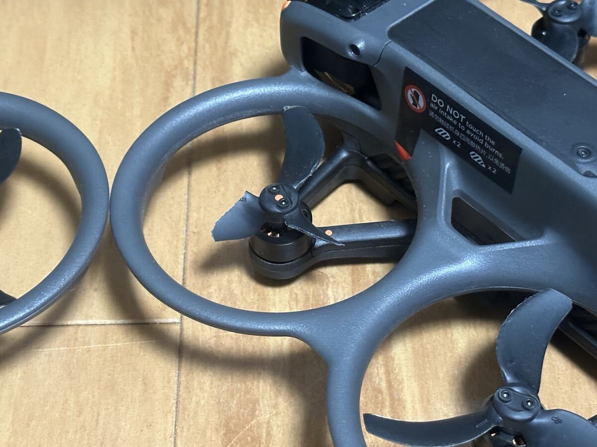また、画像にある通り、枝に引っ掛けた影響でプロペラが1つ損傷しております。ご承知おきいただければ幸いです。