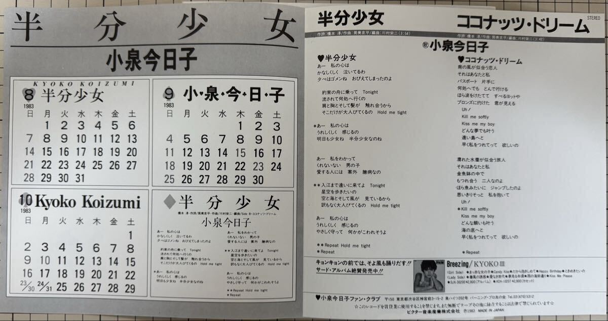 ※即決◆小泉今日子/半分少女/ココナッツ ドリーム (初回盤 美品EP)筒美京平、10枚まで送料230円