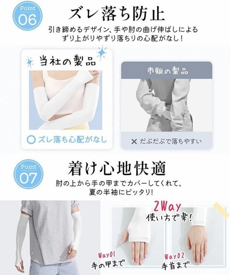 冷感アームカバー機能があり、着けた瞬間にひんやりと涼しいです。接触冷感材質を使用し、水や汗で濡れると気化熱の作用により冷却効果が発生し、肌と接触した瞬間に温度を約3〜5度下げます。熱中症対策にも効果的です。