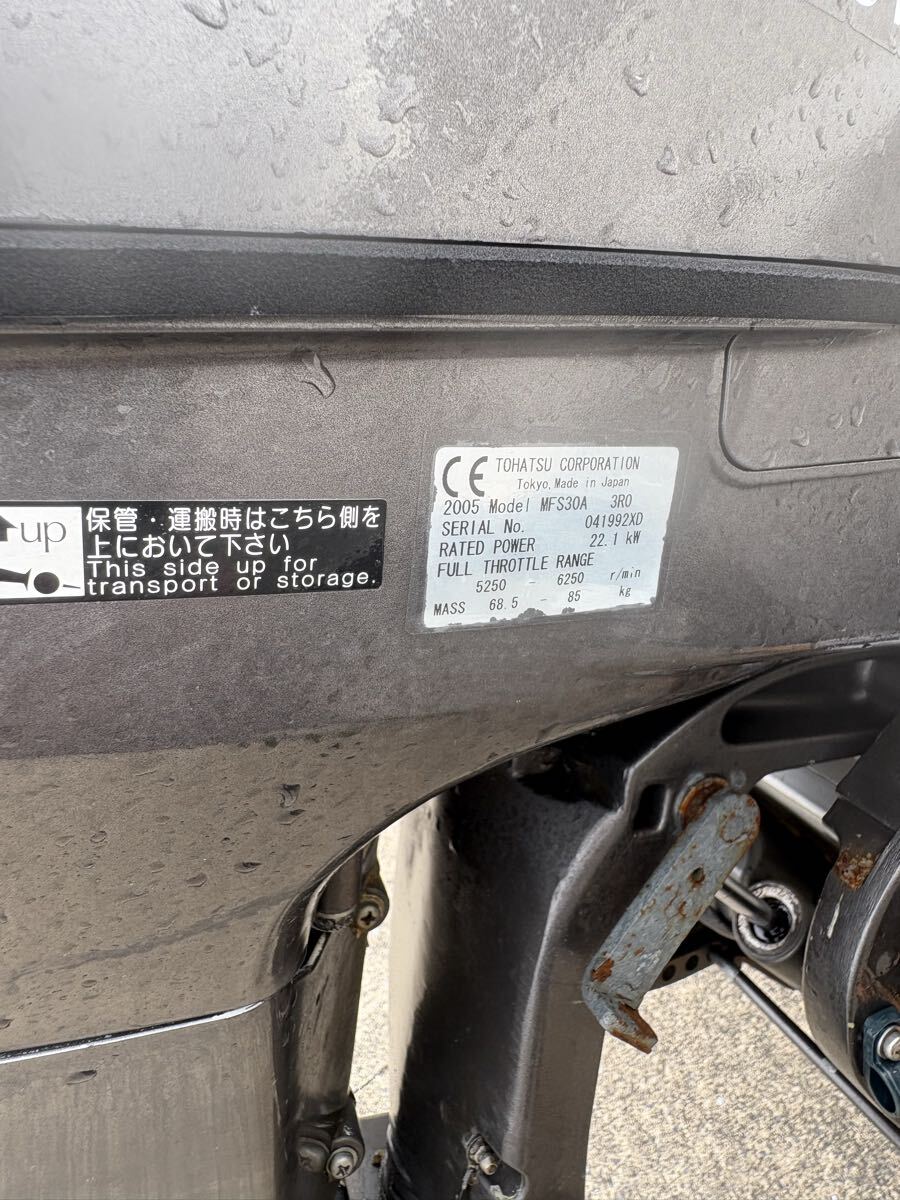H16年製トーハツ4スト30馬力キャブレタータイプ、使用時間は不明、電動チルト良好、スタビライザー付属、画像無いですがエンジン本体の外見も綺麗です。