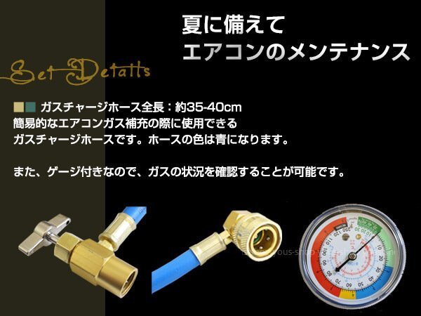 商 品 説 明簡易的なエアコンガス補充の際に使用できるガスチャージホースとメーターのセットとなります。