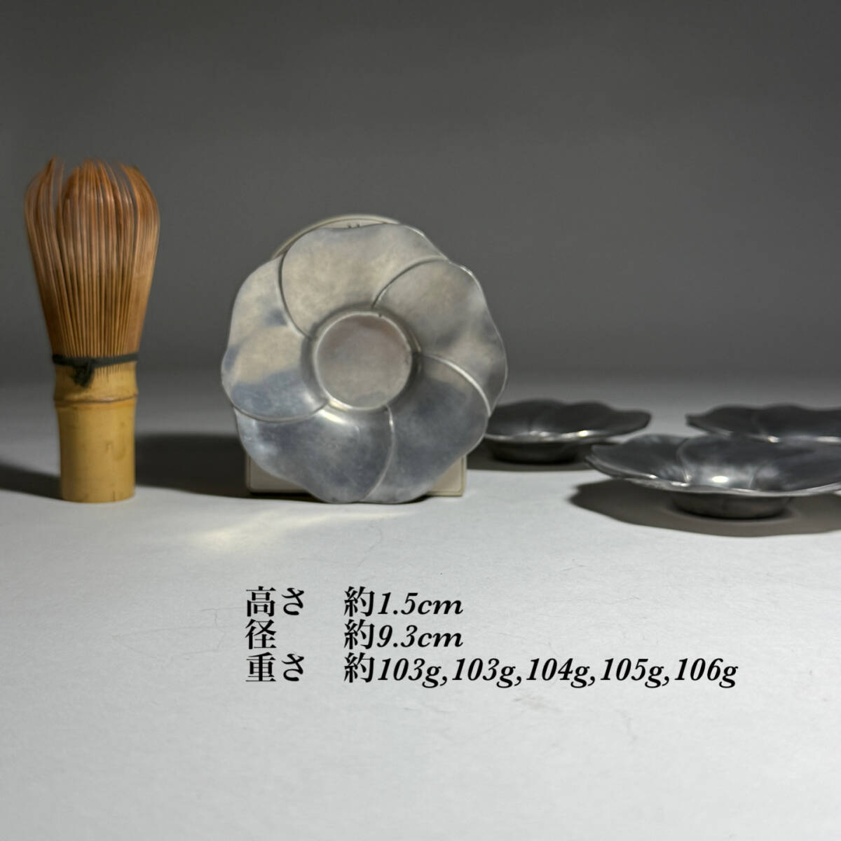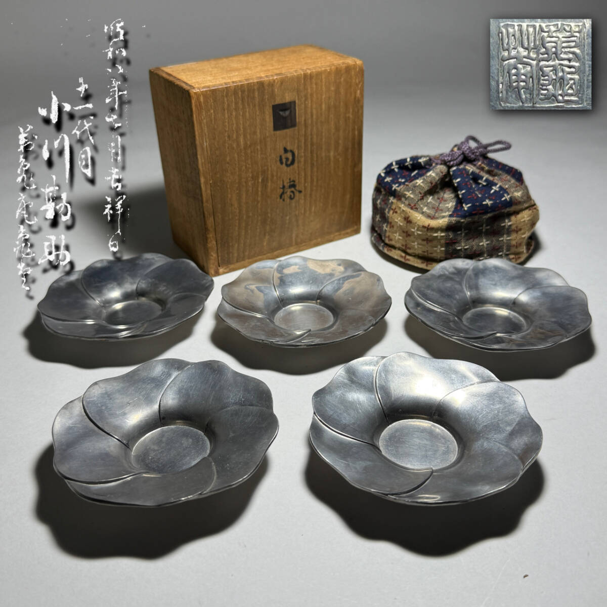 Product name: 【茂蔵】十一代 小川勘助造 萬亀庵亀堂 古錫 銘『白椿』花弁形茶托 五客揃 共箱・仕覆付き 総量521g 大正期 茶道具 煎茶器