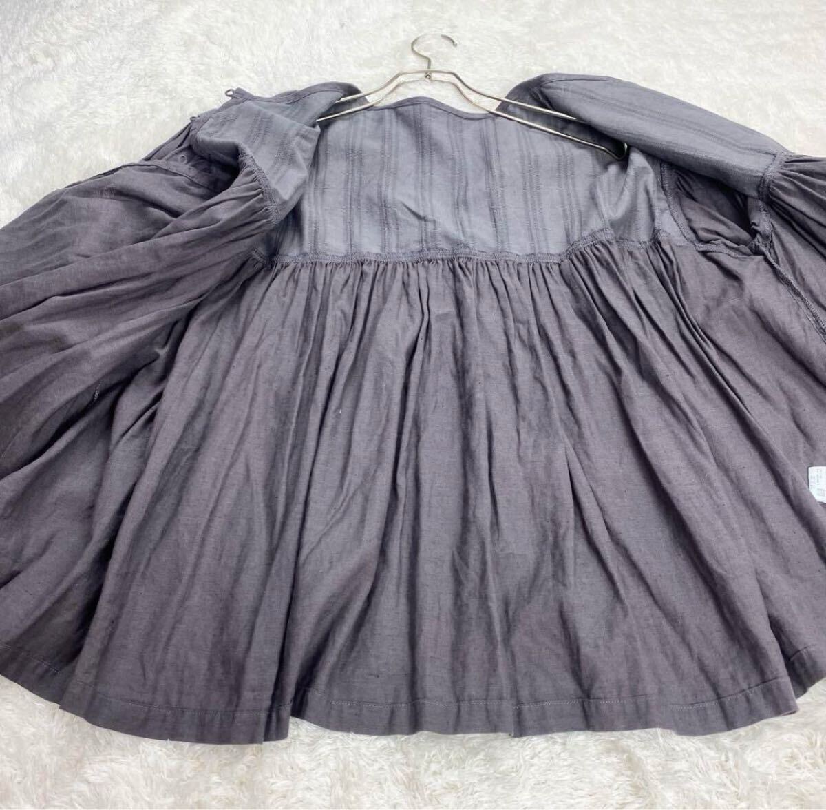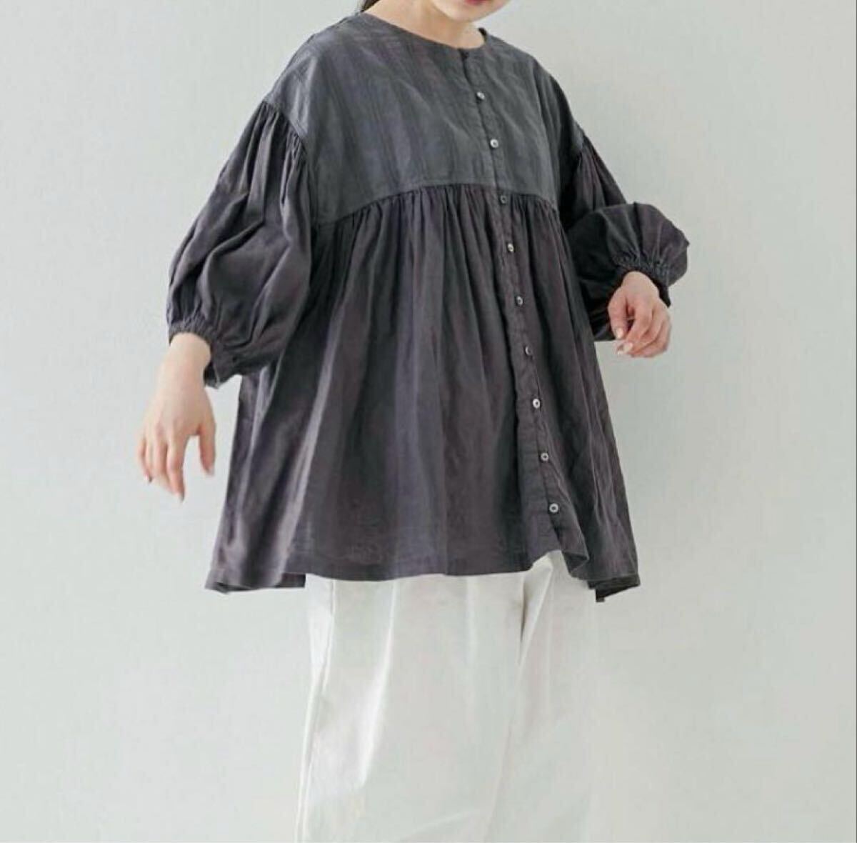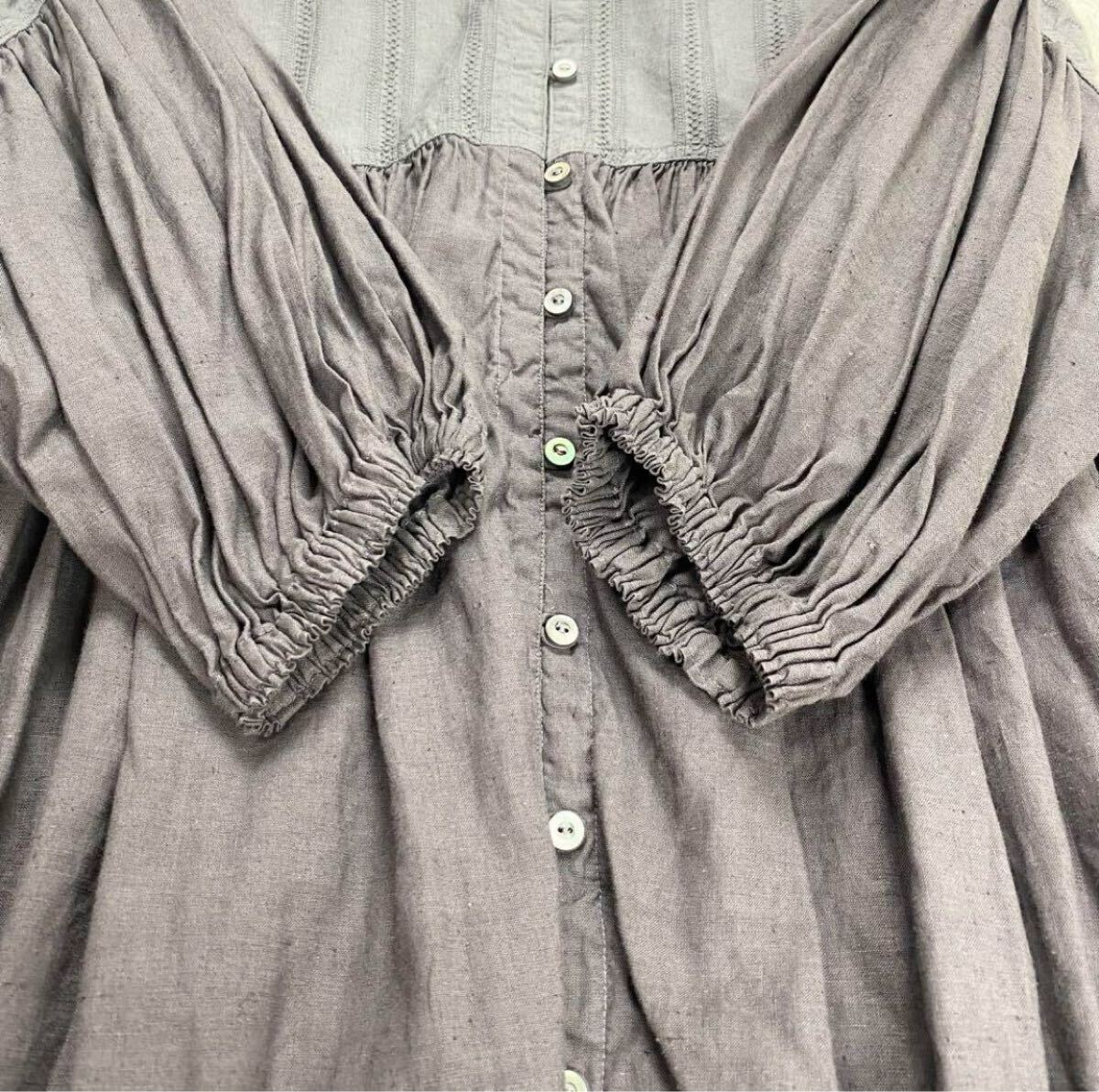 2023年コレクション nest Robe UpcycleLinoのカラミ織り天然染めドッキングブラウスです。カラーは天然染めの薄いスモークパープルです。本体は麻綿の薄すぎず程よい厚みの生地であしらわれ、トップ部分は立体的な織り柄を配した麻綿生地を使用。前立てはループ・ボタン留め、ボリュームのあるバルーンスリーブの袖口はゴム入りです。裾には UpcycleLinoのピスネーム付き。ポケットはございません。定価(メーカー希望小売価格)28,600円の商品です。