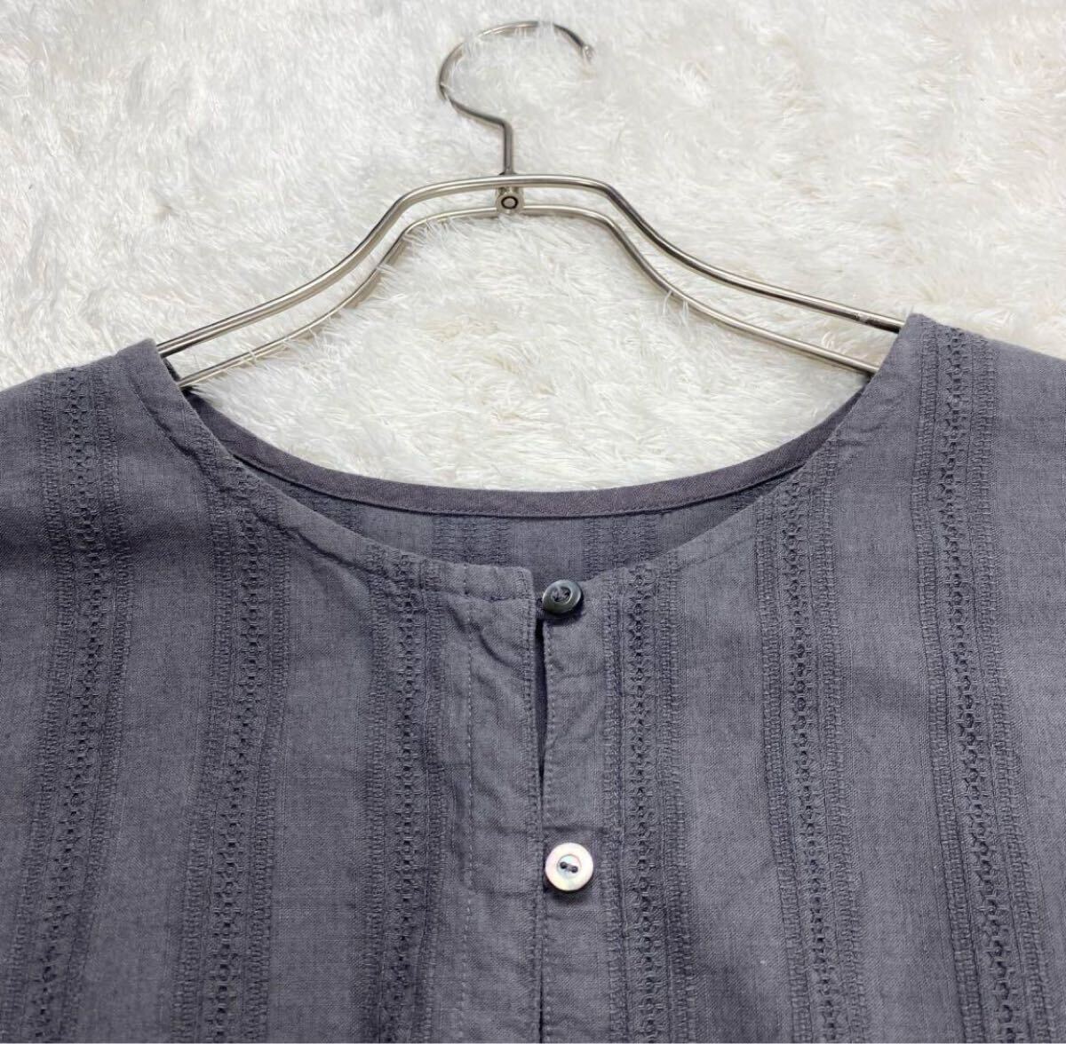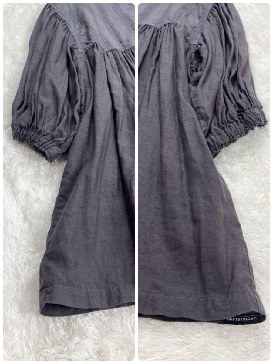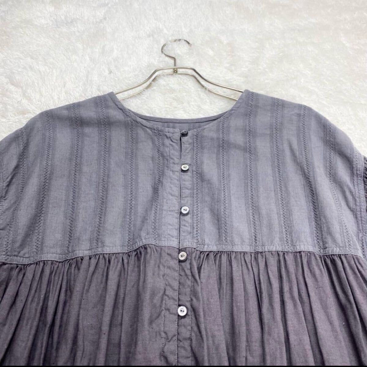 2023年コレクション nest Robe UpcycleLinoのカラミ織り天然染めドッキングブラウスです。カラーは天然染めの薄いスモークパープルです。本体は麻綿の薄すぎず程よい厚みの生地であしらわれ、トップ部分は立体的な織り柄を配した麻綿生地を使用。前立てはループ・ボタン留め、ボリュームのあるバルーンスリーブの袖口はゴム入りです。裾には UpcycleLinoのピスネーム付き。ポケットはございません。定価(メーカー希望小売価格)28,600円の商品です。