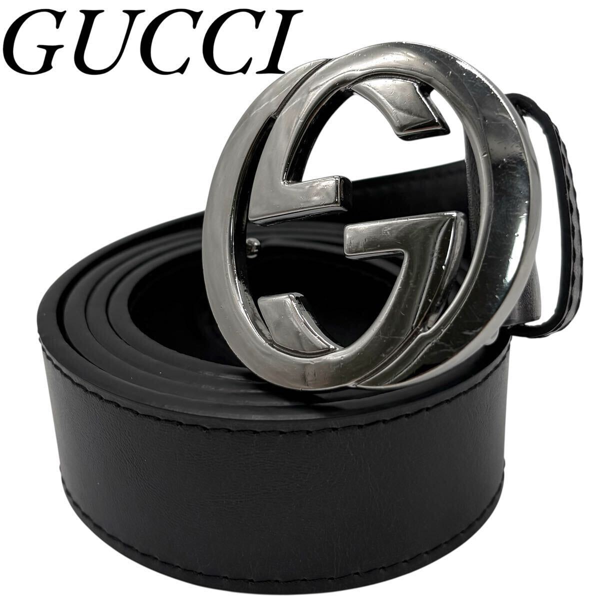 【美品/最高級】GUCCI グッチ ベルト インターロッキング デカロゴ GG レザー ブラック 黒 シルバー 銀 通勤 仕事 ビジネス メンズ 4cm幅