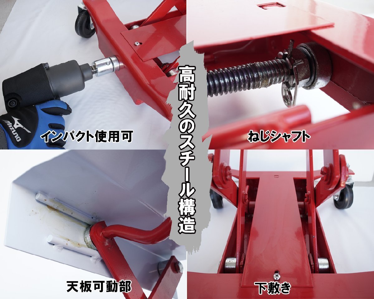 このローリフトミッションジャッキはジャッキスタンドで上げた車両の下で使用するのに適してます。