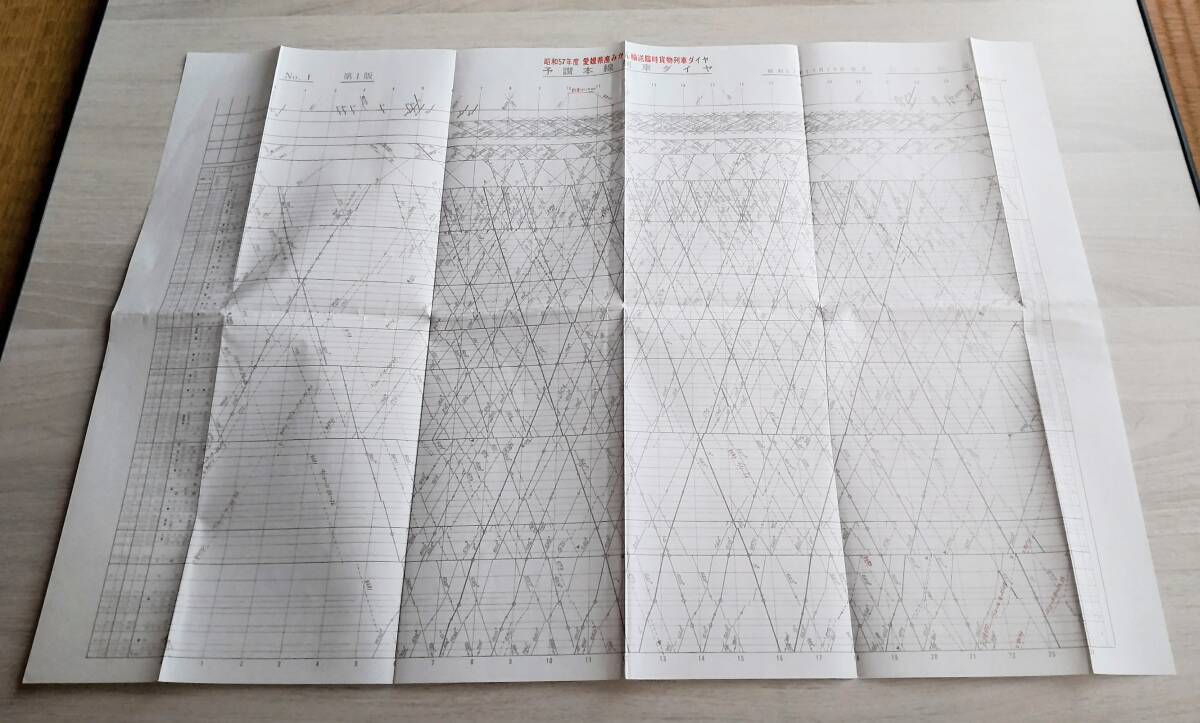 1枚で2種類の列車ダイヤ表が確認できます。赤いラインと赤文字がみかん輸送臨時貨物列車ダイヤです。片面印刷。