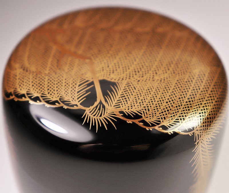松本正(正一)作 輪島塗 木地黒塗柳蒔絵棗です。 黒塗の柔らかな光沢を湛える器面に枝垂れ柳の姿を精緻な蒔絵で描いた作。 一本の幹から流麗に広がる枝葉は、金の繊細な蒔絵により風趣をたたえ 全体に静謐でありながらも豊かな情感を漂わせるようです。 黒塗の地と金蒔絵との対比が輪島塗ならではの深みを際立たせています。