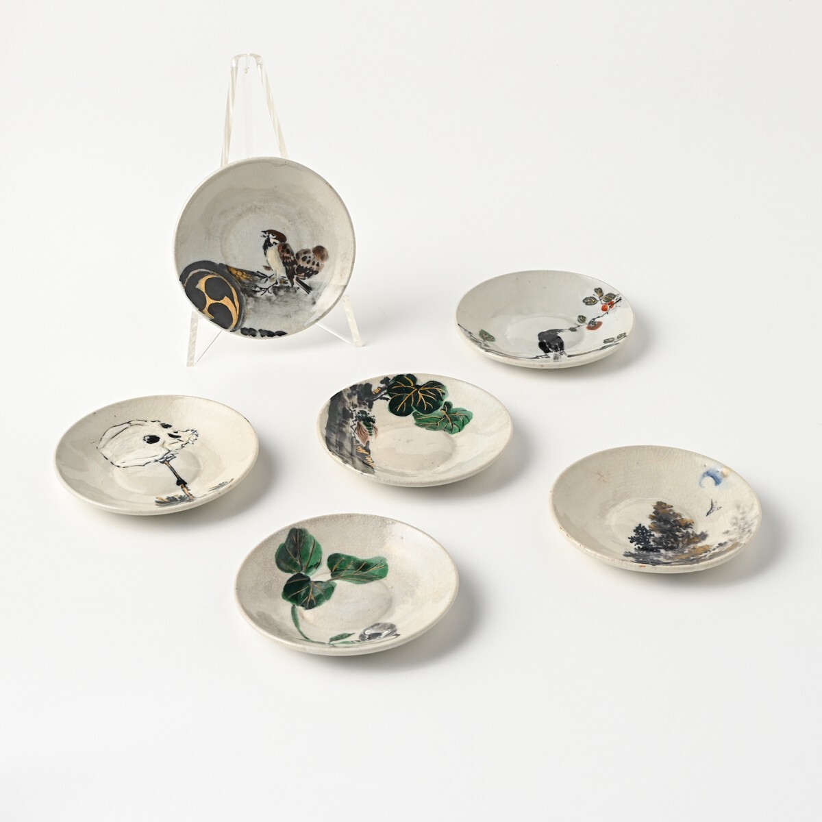 Product name: 無想庵 柴田如阿弥造 図変わり 色絵 銘々皿 計6客【1客ニュウ有】鳥獣 戯画 花鳥 髑髏 直径約140mm 京焼 骨董 古美術 古玩 アンティーク