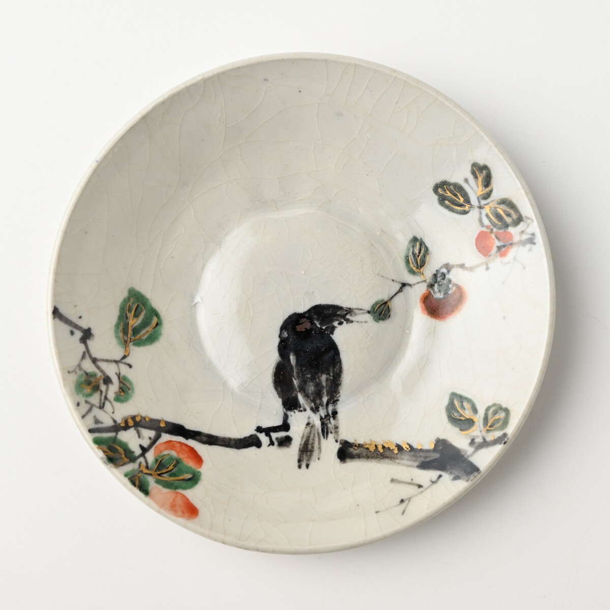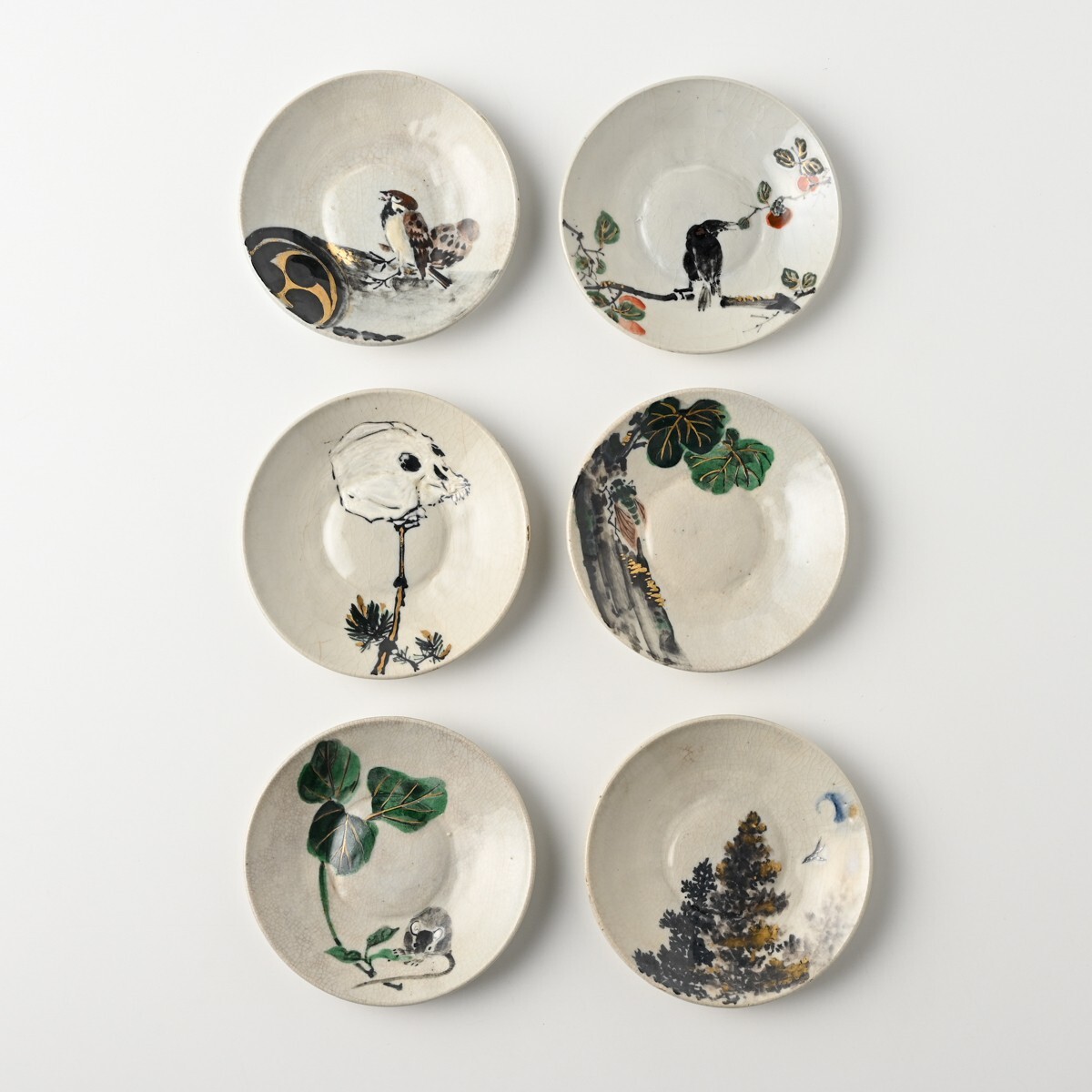無想庵 柴田如阿弥造 図変わり 色絵 銘々皿 計6客【1客ニュウ有】鳥獣 戯画 花鳥 髑髏 直径約140mm 京焼 骨董 古美術 古玩 アンティーク