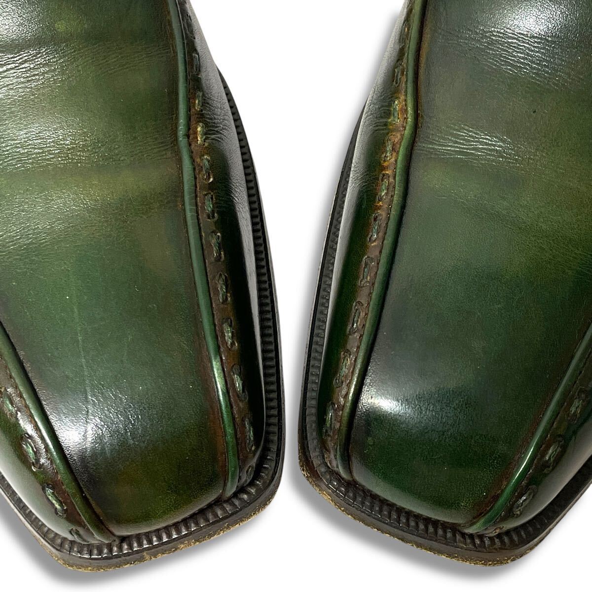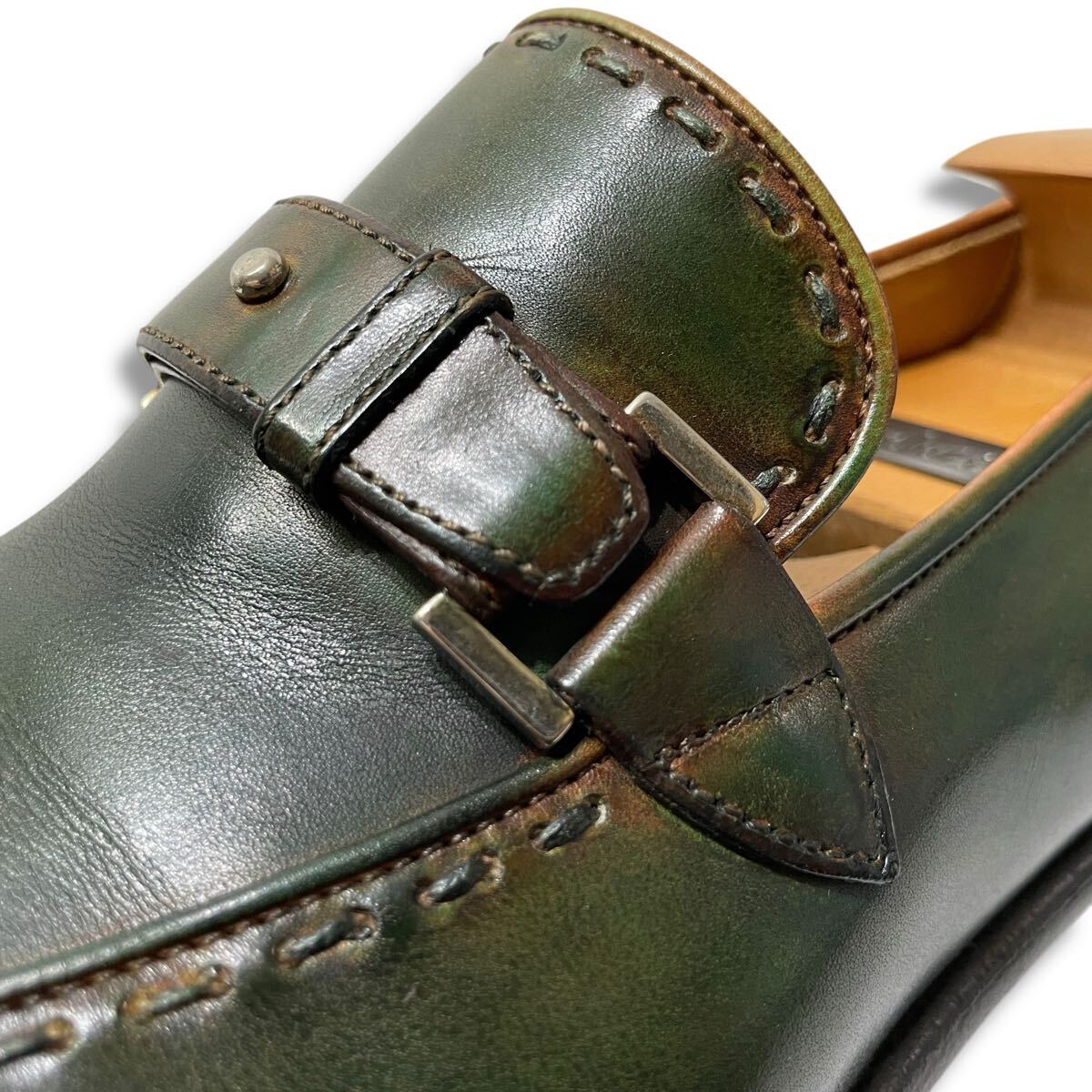 深いボトルグリーンから淡いモスグリーンへの自然なグラデーションが特徴で、つま先から光を透かすような奥行きのある色合い。手作業で重ねたパティーヌにより、琥珀や翡翠のような多層的な輝きを楽しめる、一足ごとに表情が異なる特別な靴です。」