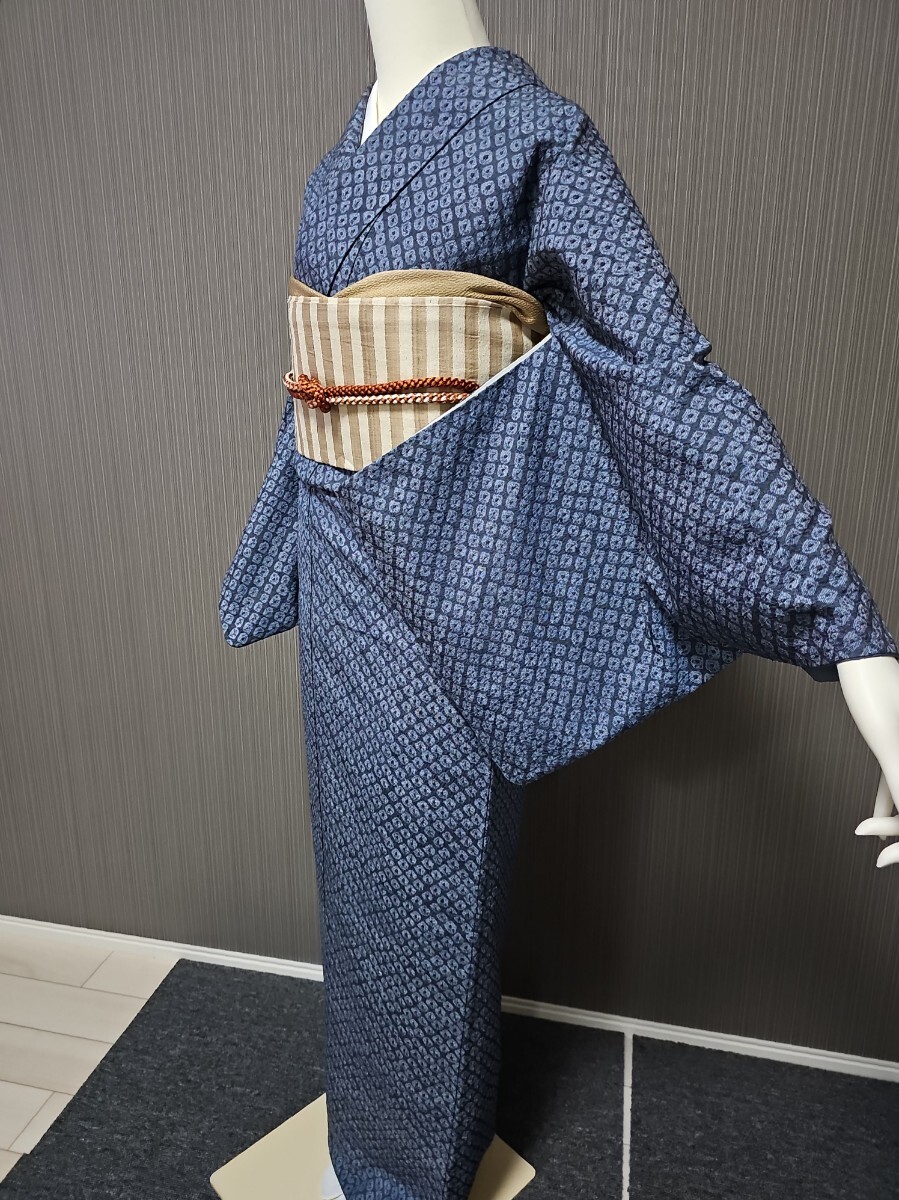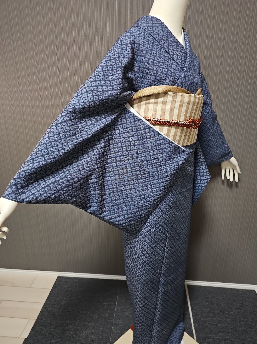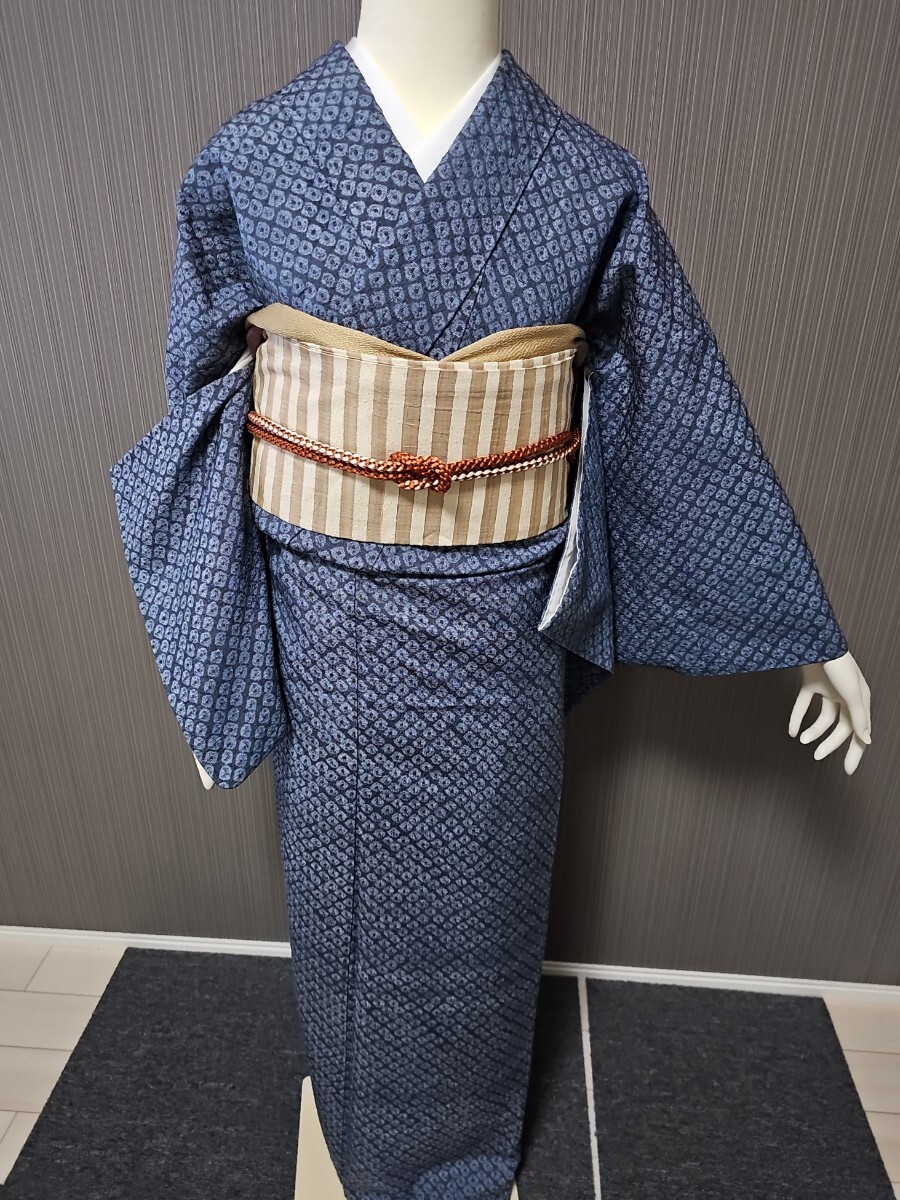 ★柔らかさと良い塩梅のコシを有する織地、米沢漢方染【菅原工房 菅原 結】による青鼠系の絞り染がモダンな美しさに満ちた上等なお召し物でございます。