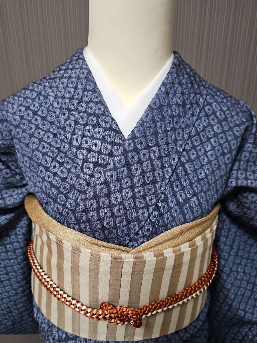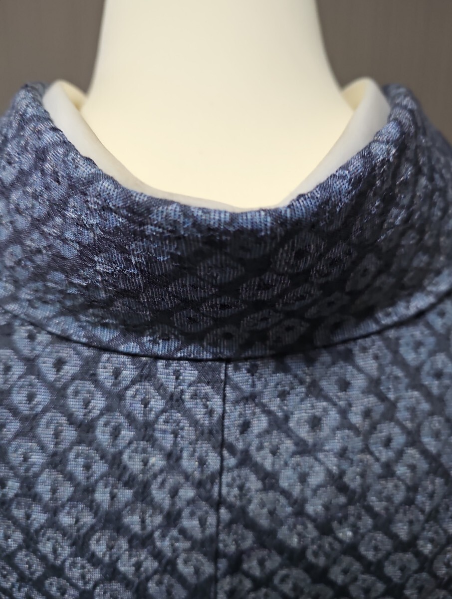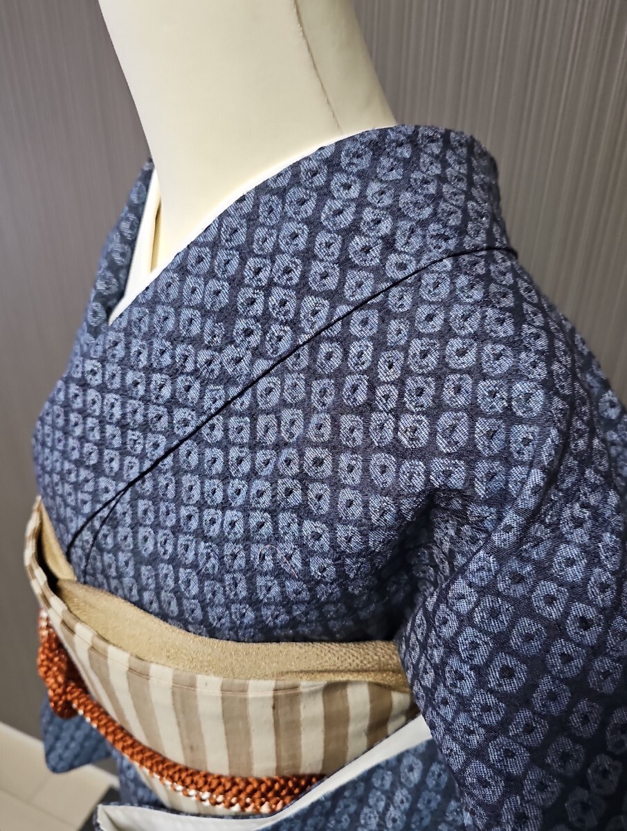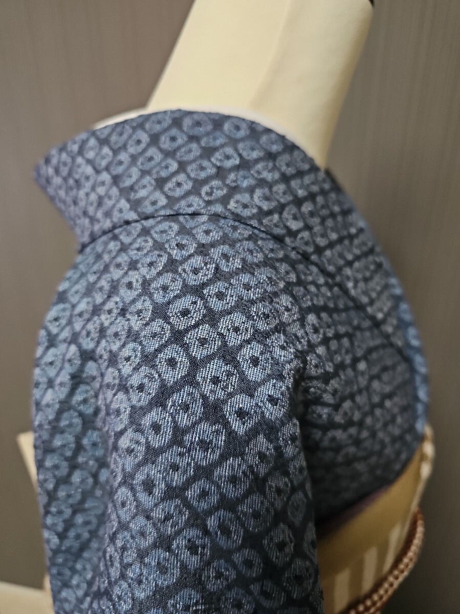 ★柔らかさと良い塩梅のコシを有する織地、米沢漢方染【菅原工房 菅原 結】による青鼠系の絞り染がモダンな美しさに満ちた上等なお召し物でございます。