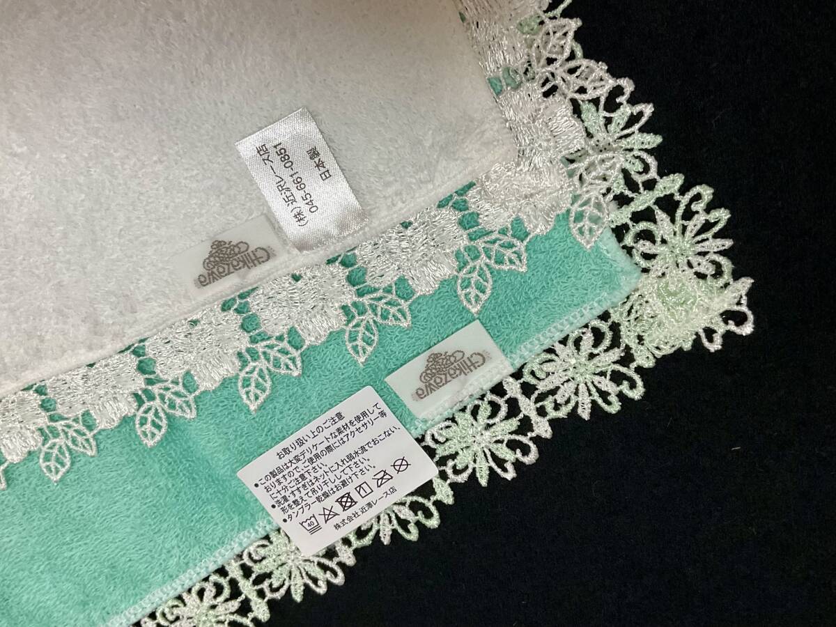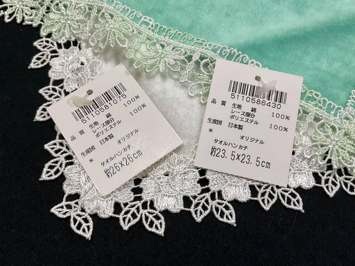 未使用 近沢レース タオルハンカチ 2枚 美しいレース装飾 タグ付き新品 '(ホワイト&エメラルドグリーン?)匿名配達