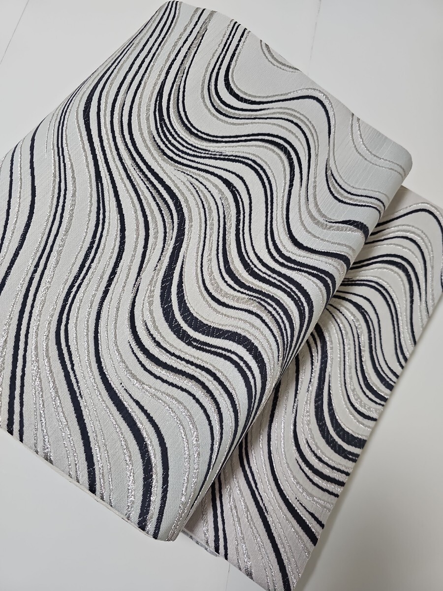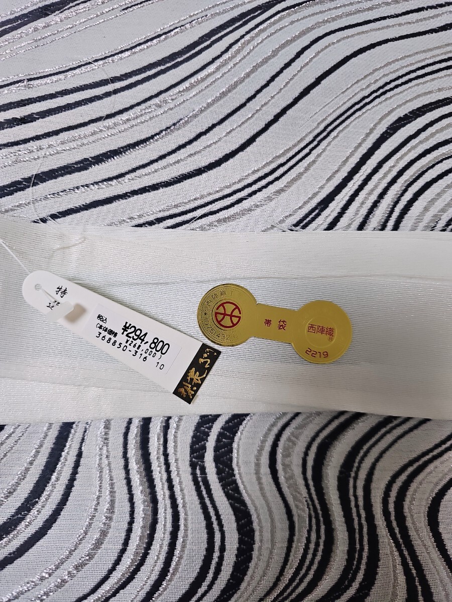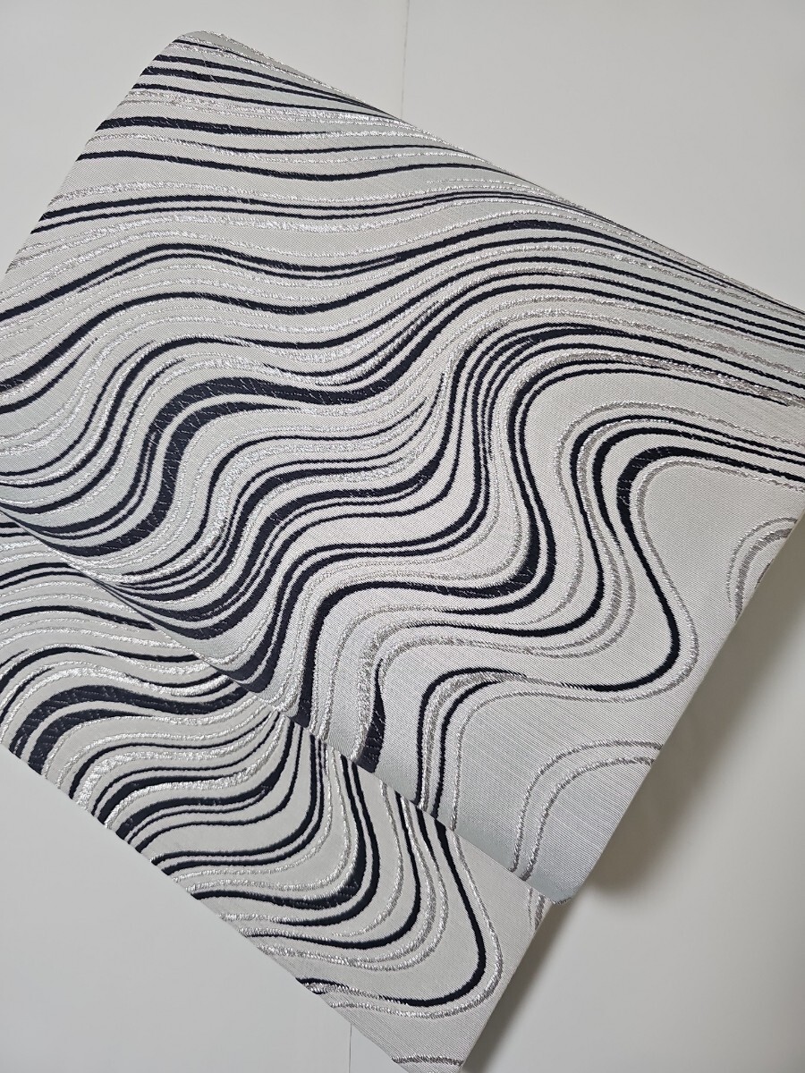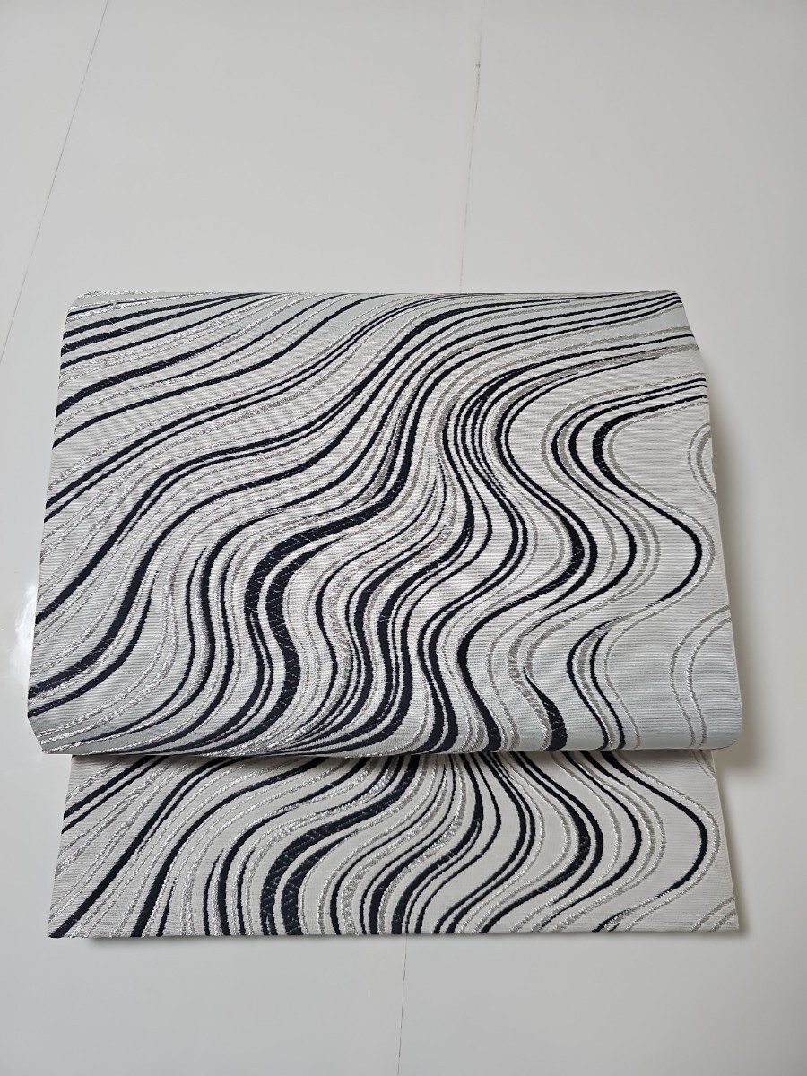 良い塩梅の張りと柔らかさの有る織地、灰白×薄ブルーの暈し、銀糸使いの立体的流水文様を織で表現したシンプルモダンさが魅力に満ちた上等なお品ものでございます。