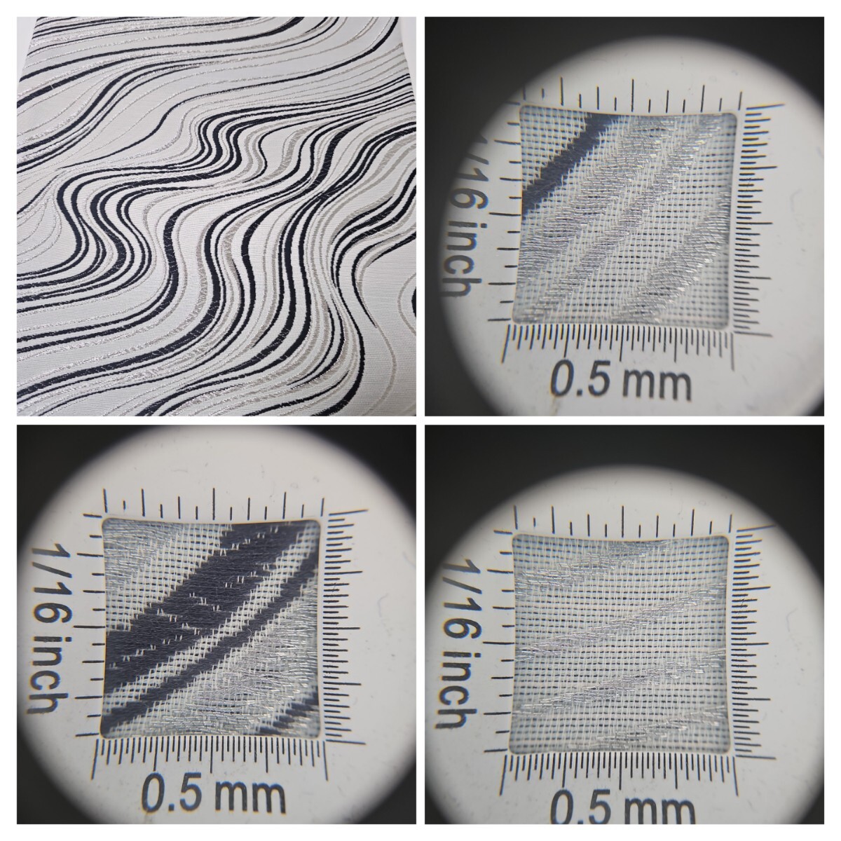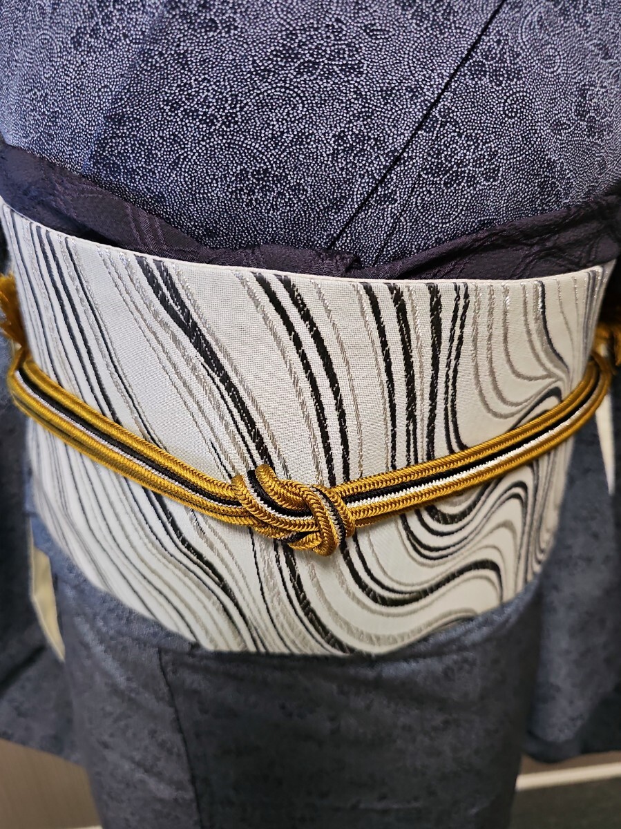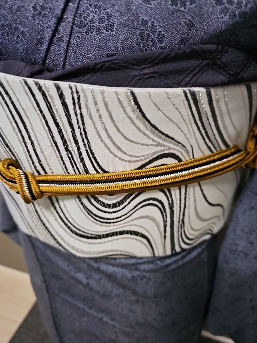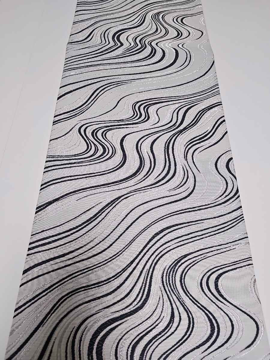 良い塩梅の張りと柔らかさの有る織地、灰白×薄ブルーの暈し、銀糸使いの立体的流水文様を織で表現したシンプルモダンさが魅力に満ちた上等なお品ものでございます。