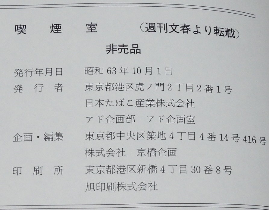 Product name: 【たばこPR小冊子】喫煙室 Smoking Room 1988 日本たばこ 昭和63年/村上龍/笹沢佐保