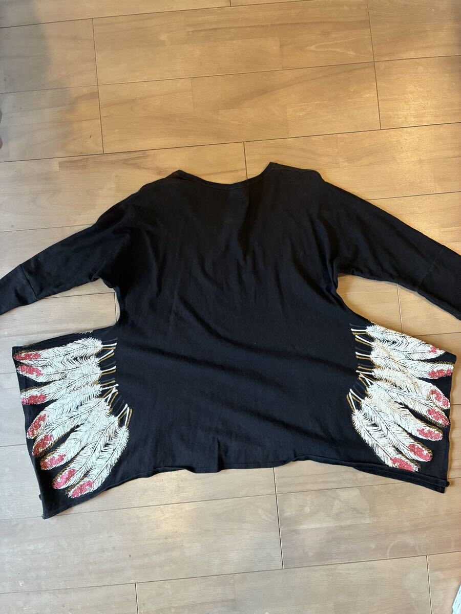 七分くらいの袖丈で腰の辺りが大胆に変形しており着ていただくとフェザーのプリント柄が非常に綺麗なお品です