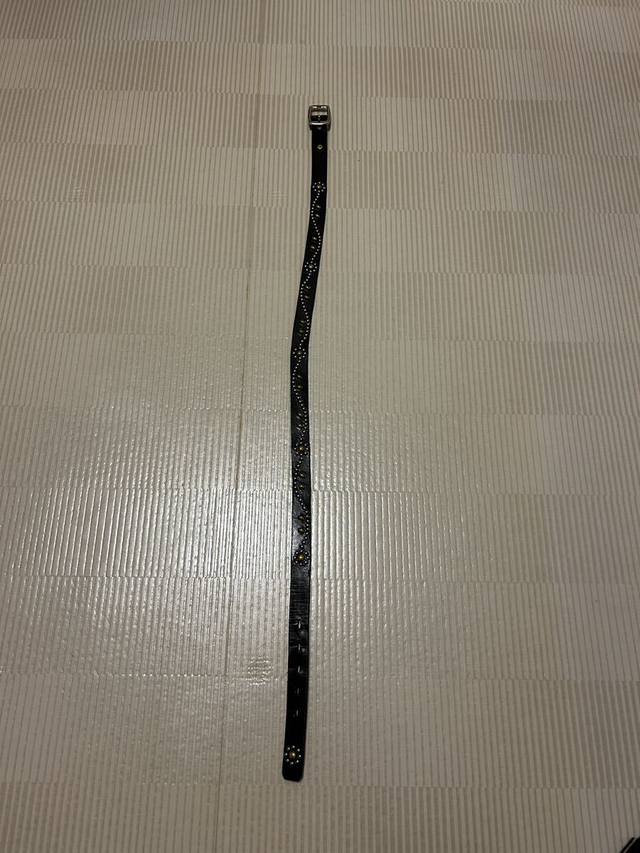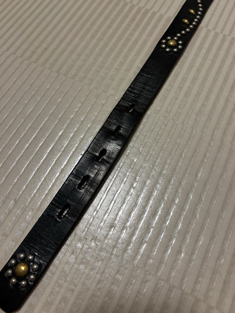 スタッズと装飾模様が特徴の黒いレザーベルト。