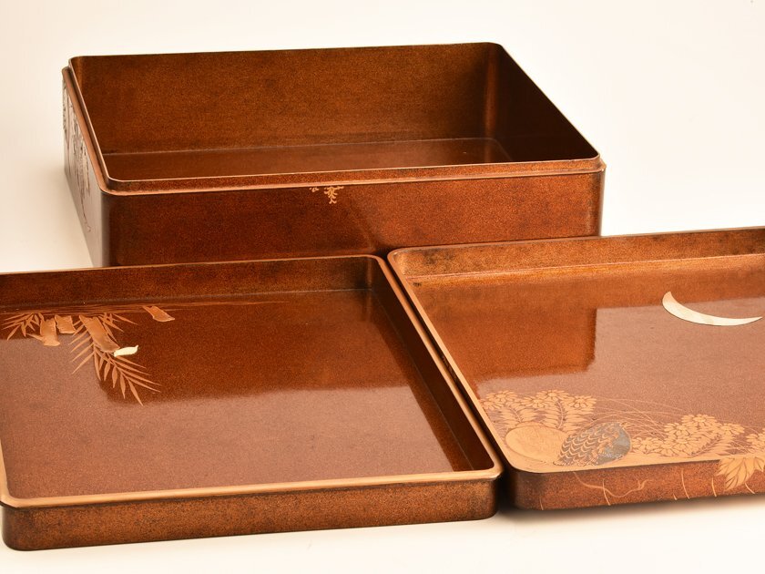 Product name: 【流】時代漆器 総梨地 光琳蒔絵月に鶉菊図 螺鈿細工文庫箱 幅42cm UC930