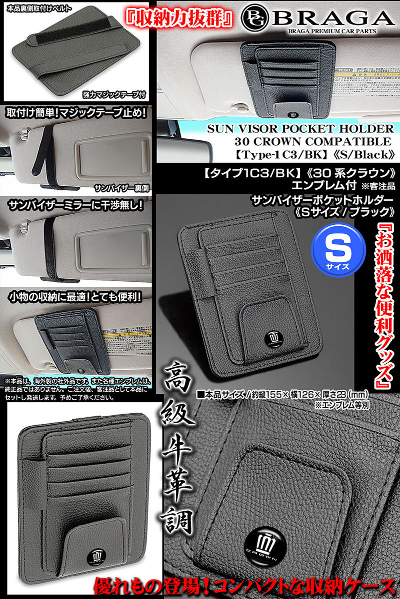 Product name: クロスオーバー/セダン/30系クラウンマークエンブレム付/客注品/サンバイザー ポケット ホルダー S黒/タイプ1C3/BK/収納 整理/BG BRAGA