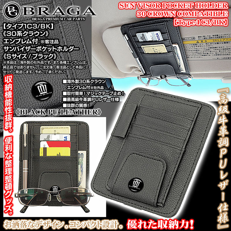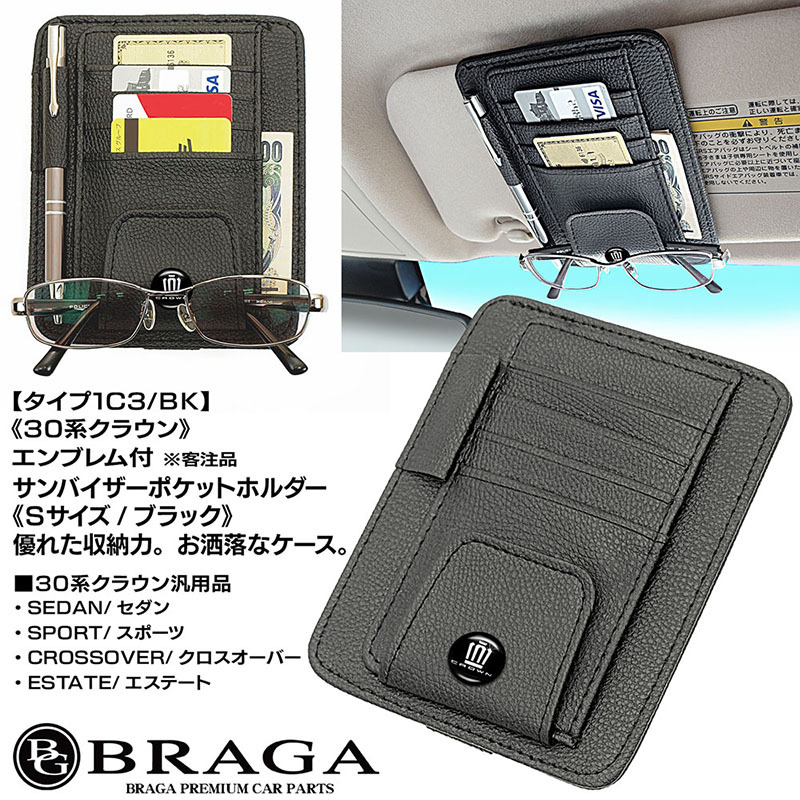 クロスオーバー/セダン/30系クラウンマークエンブレム付/客注品/サンバイザー ポケット ホルダー S黒/タイプ1C3/BK/収納 整理/BG BRAGA
