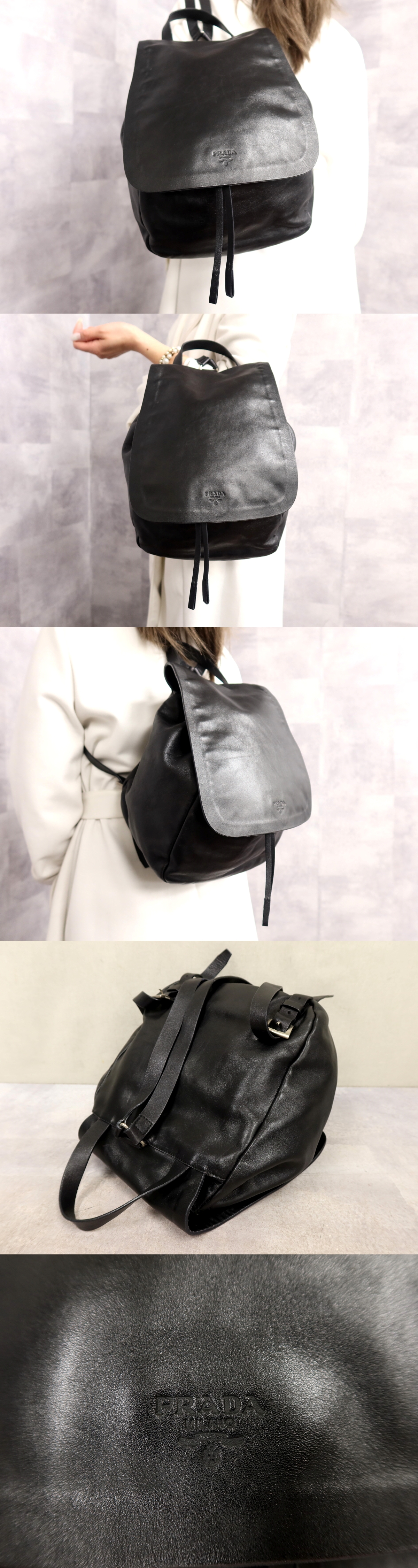 Store ●超美品●PRADA プラダ●ロゴ型押し●カーフ レザー 本革●リュックサック●黒●シルバー金具●イタリア製●収納 かばん●Js65917