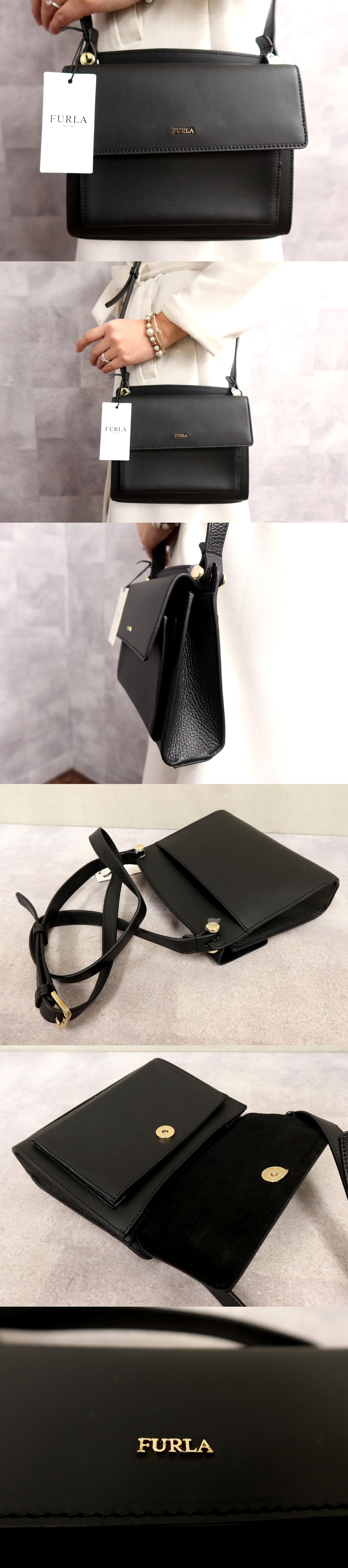 Store ●超美品●新品同様●FURLA フルラ●フラップ●カーフ レザー 本革●ショルダー バッグ●黒●ゴールド金具●斜め掛け●かばん●Js66314