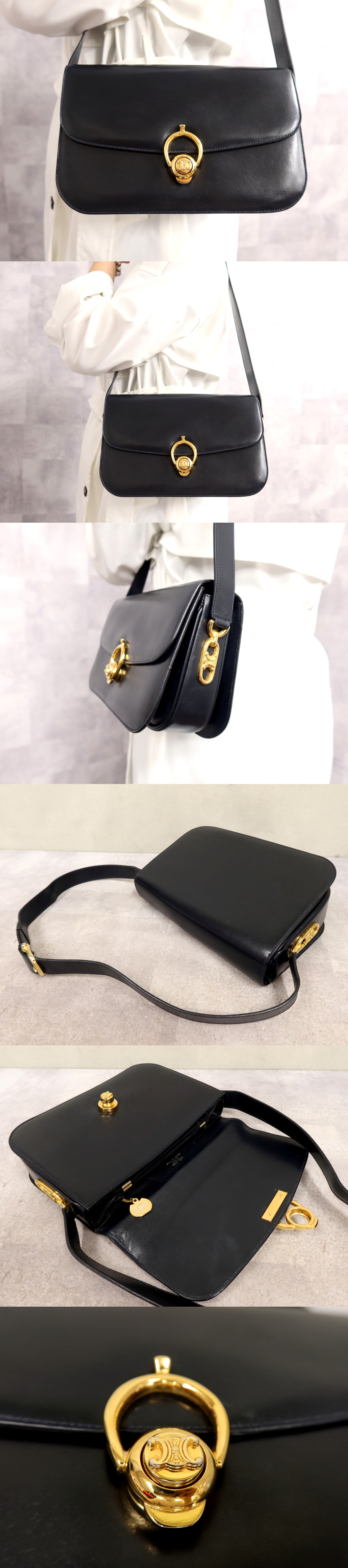 Store ●超美品●CELINE セリーヌ●ロゴ金具●カーフ レザー 本革●ショルダー バッグ●ダークネイビー●ゴールド金具●ヴィンテージ●Js66964
