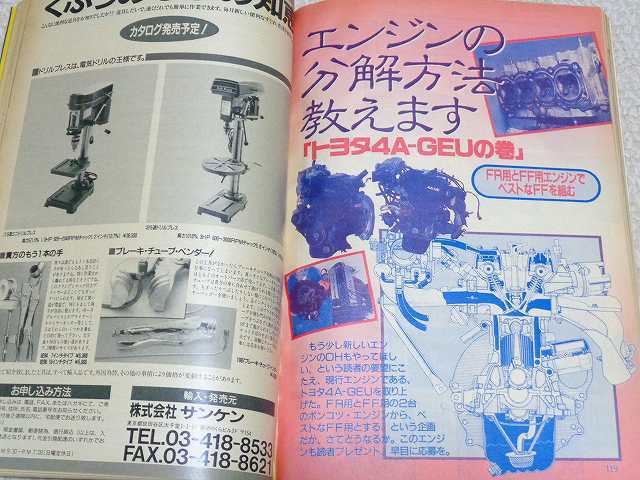 「エンジンの分解方法教えます/トヨタ4A-GEUの巻」については2色カラーで11ページにわたって特集されています。FF用とFR用エンジンの2台を使って、ベストなFF用エンジンを組み上げるというテーマで、今号の内容は分解を中心にしています。FF用とFR用とでは補器類やマウント部等で縦置・横置用に対処しているなど詳細な違いが見て取れて興味深いです。4A-GEUのオーバーホールを考えていらっしゃるオーナー様やプロ業者様におススメの内容となっています。