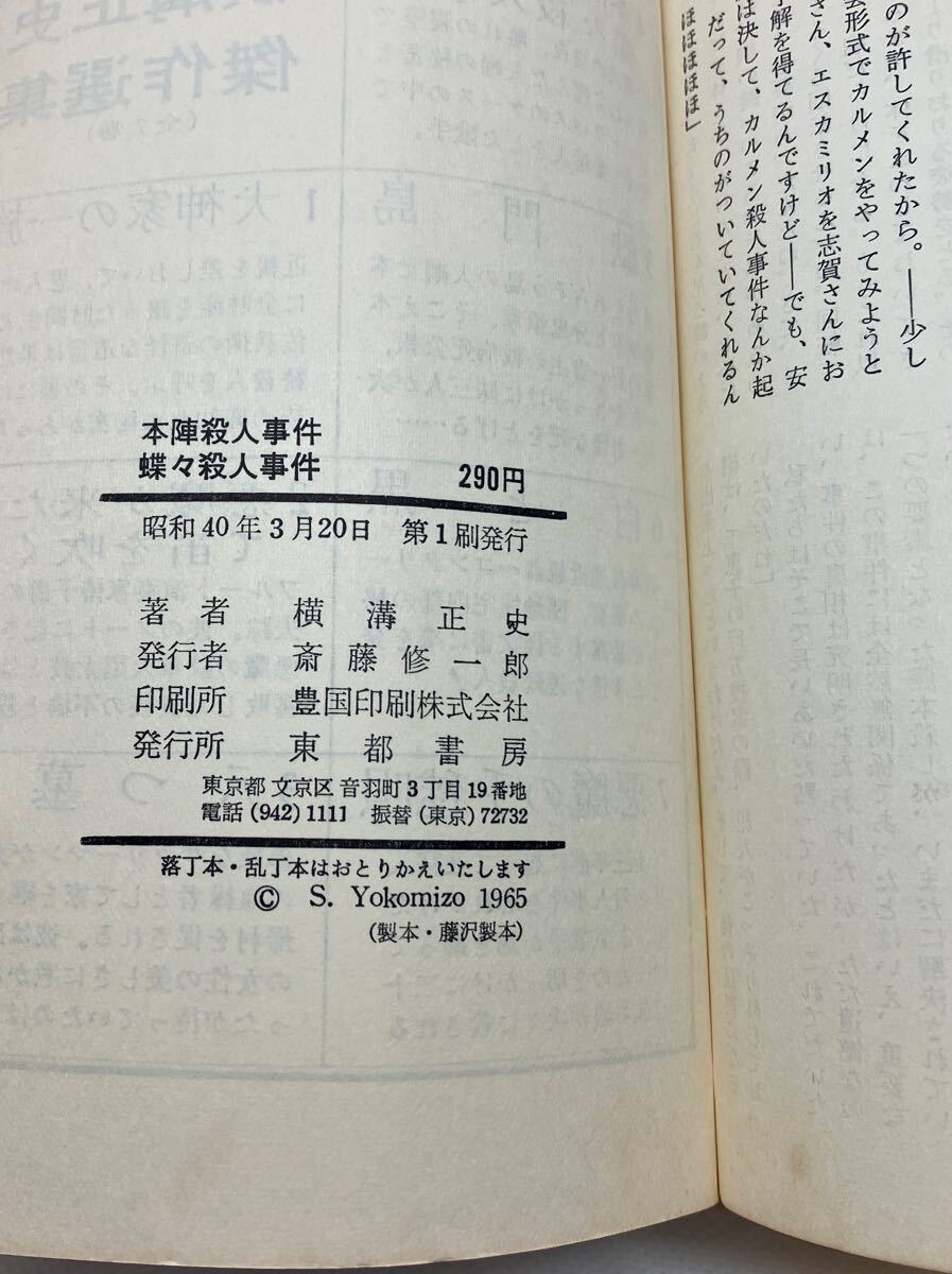 横溝正史傑作選集4 本陣殺人事件・蝶々殺人事件 昭和40年 東都書房 新書サイズ