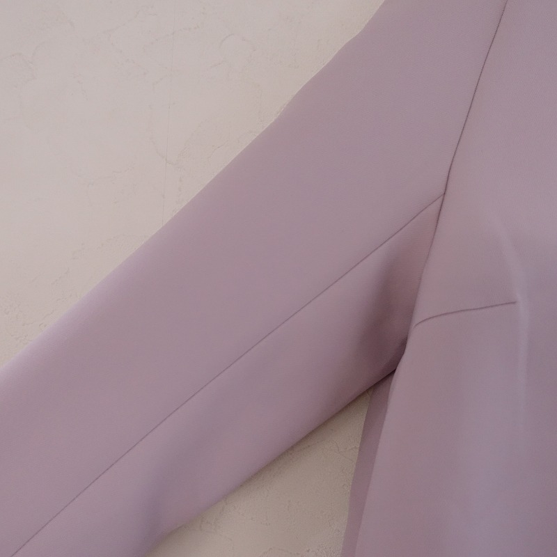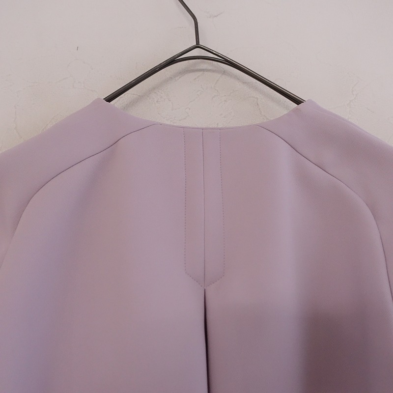 2023年AWコレクションTiaraのノーカラーハーフコートです。カラーはくすんだラベンダーピンクで、ドライな質感のポリエステル地で仕立てられております。ノーカラーデザインで、フロントはボタン&フック仕様、バックに大きなボックスプリーツが施されております。両サイドにシームポケットが付いており、定価(メーカー希望小売価格)49,500円 税込みの商品です。