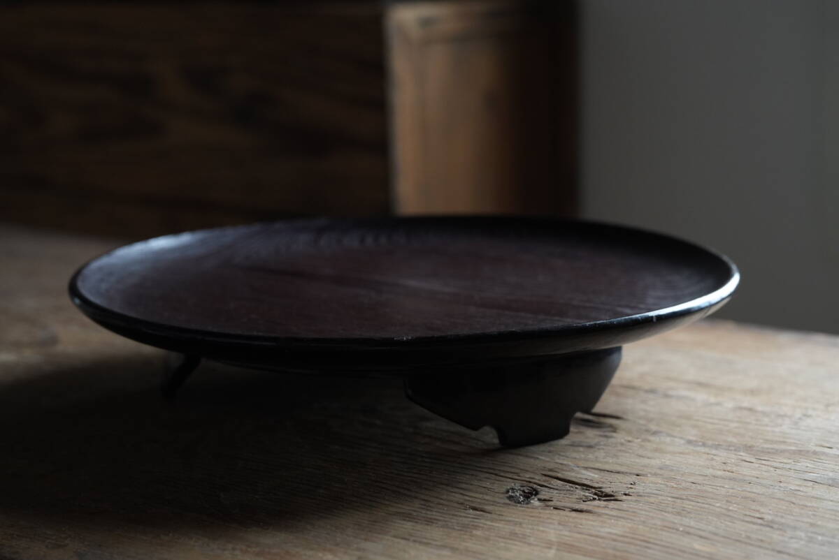 古い木目の美しい欅の三つ足膳 漆塗 漆器 / 江戸~明治期 / 骨董 和 民藝 アンティーク 木工 漆芸 漆器 花台 盆 酒器