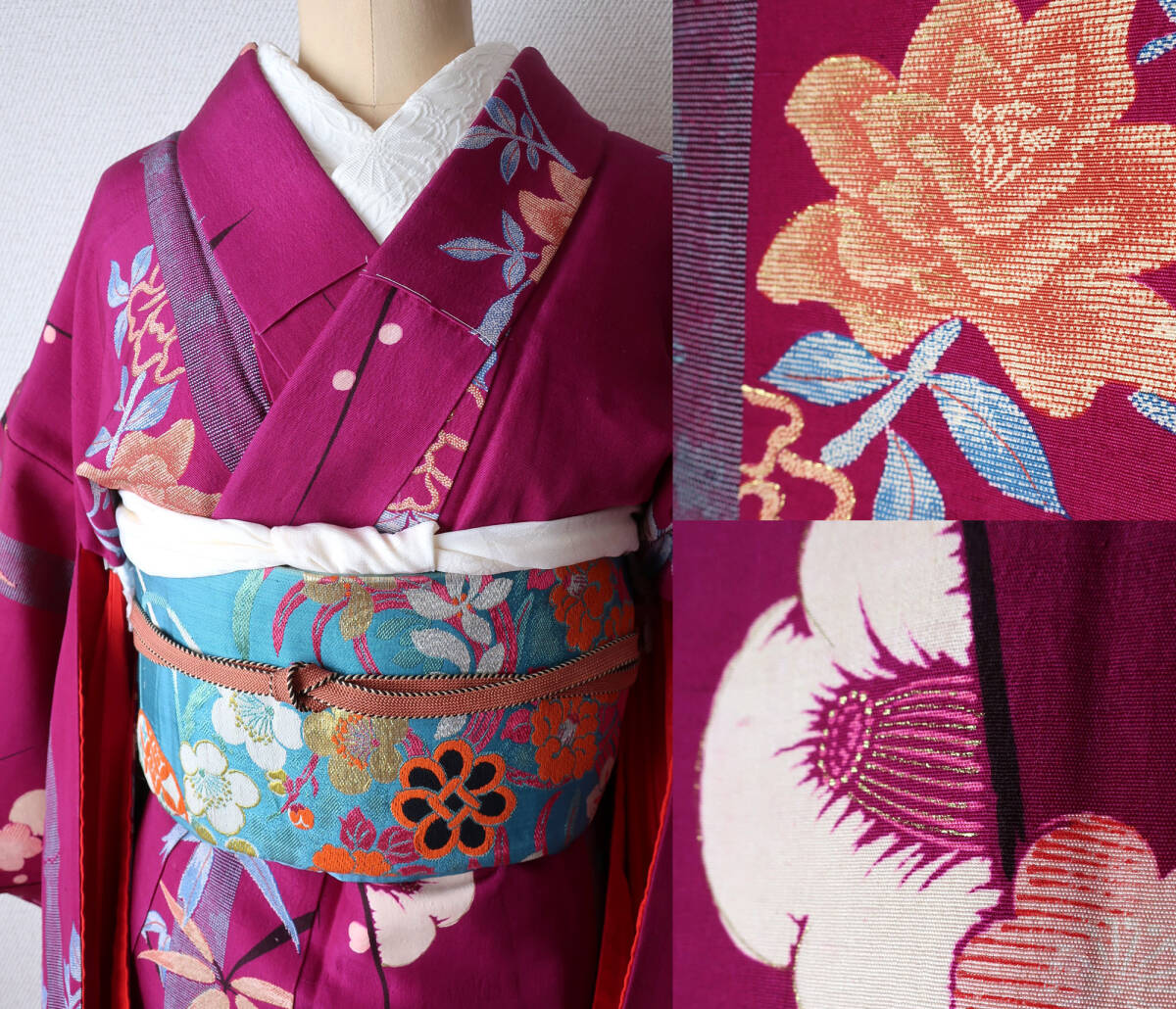 Product name: アンティーク 小紋 絹 袷着物 紫 薔薇 竹 梅 金彩 ヴィンテージ 大正ロマン レトロモダン 着物&名古屋帯セット