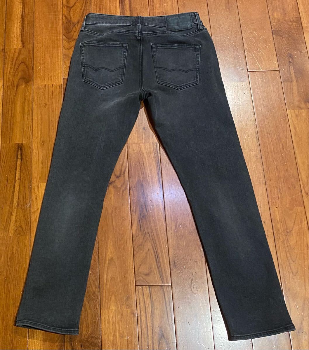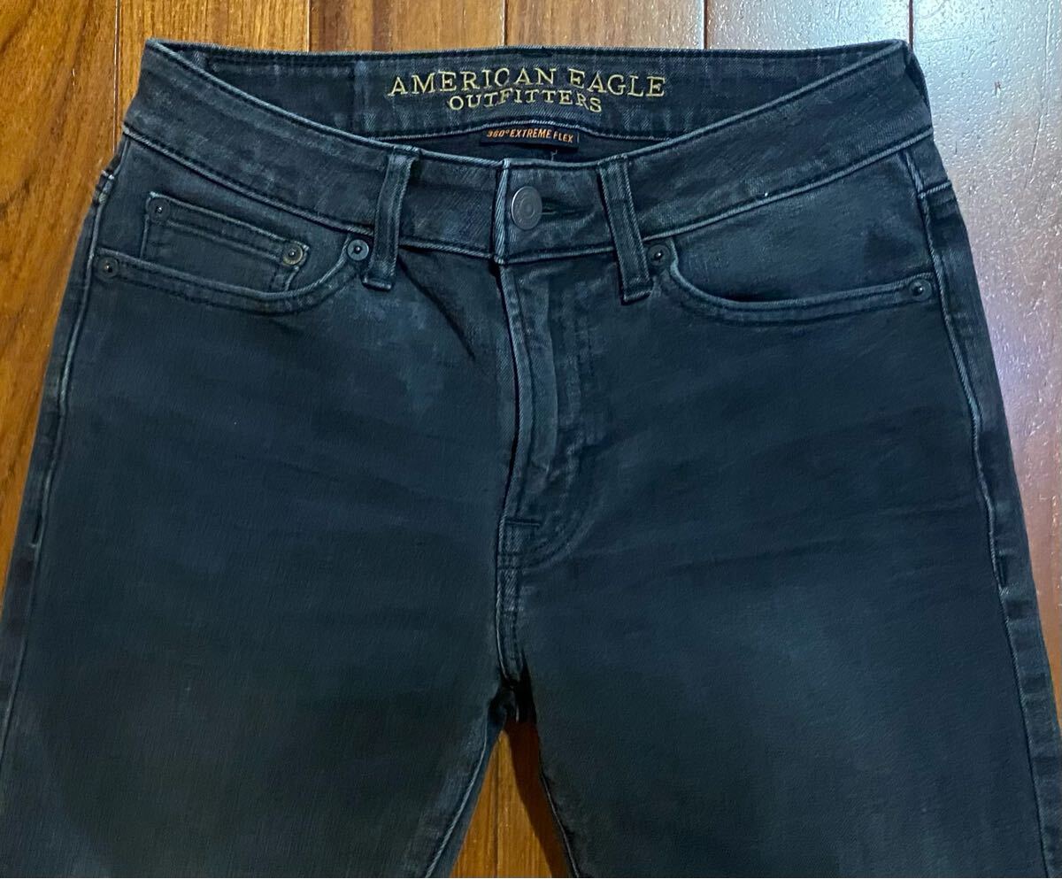 アメリカンイーグルのストレッチデニム(ジーンズ)、360° EXTREME FLEX SLIMです。色は薄ブラックです。USEDですが良いです(10段階中8程度)。生地はストレッチ入りでコットン83%、ポリエステル13%、ポリウレタン4%です。紙パッチ、ジッパーフライです。正規品です((株)イーグルリテイリング、中国製)。サイズはW28×L28でウエストは重ねずに平置きで約71cm、ヒップ約92cm、股上約24cm、股下約70cm、股下15cmのふともも部分約45cm、裾まわり約32cm、重量約530gです。発送はゆうパケットポストになります。