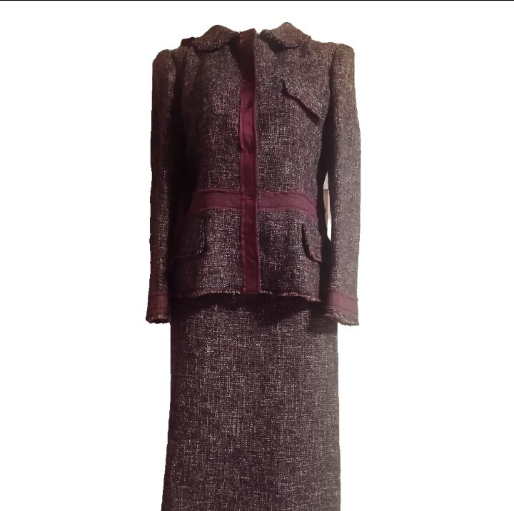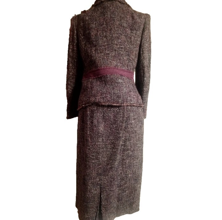 ボルドーのパイピングテープとパープルのミックスツイードを組み合わせた華やかなデザイン。