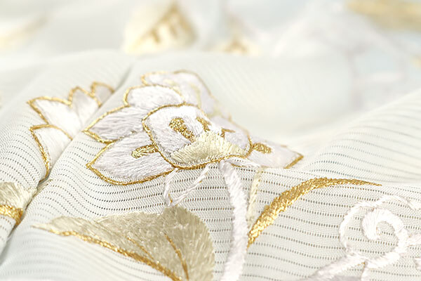 白色や薄ピンク色、薄い柳色などのお色目の糸で、更紗風の草花模様が精緻な手刺繍で施されております。