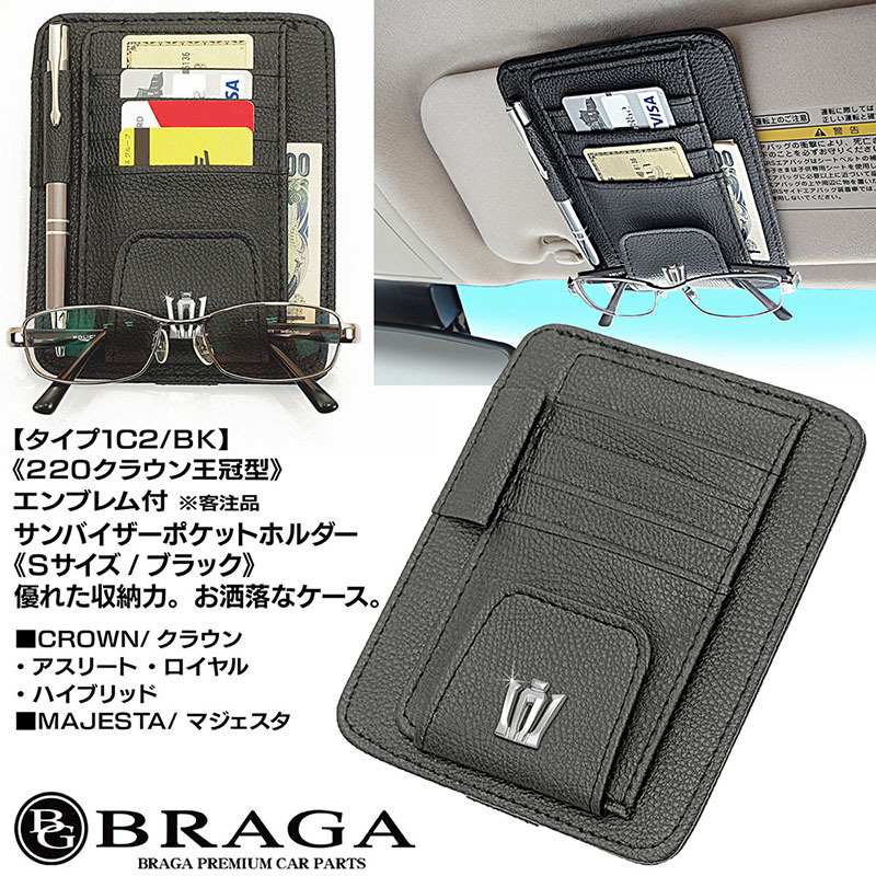 210/200/180クラウン/220クラウン王冠エンブレム付/客注品/サンバイザー ポケットホルダー S黒/タイプ1C2/BK/眼鏡 各カード 収納/ブラガ