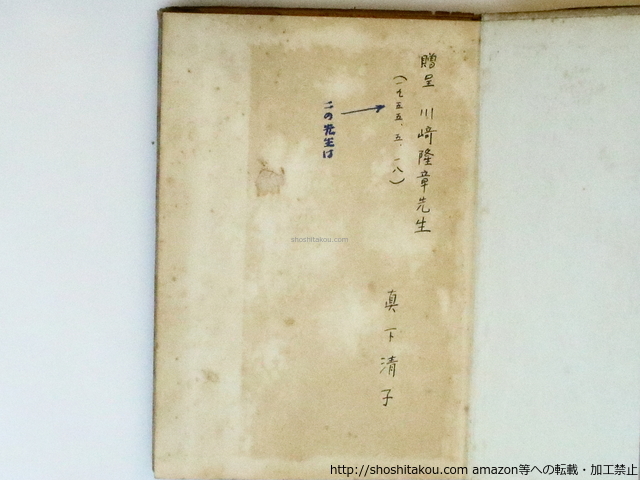 1953 ( 昭和28年 ) 初版・カバー・同人の真下清子献呈署名入(「川崎隆章」宛)、同宛直筆便箋一枚付(ペン10行献本添状「初版はもうこれだけになりましたので 先生にお贈りできて とてもうれしくぞんじております…」) ヤケ カバキズ  (検:第一未来歌集) / 四六判 / 白玉書房 / 並 (極美・美・良好・並・並下・難)