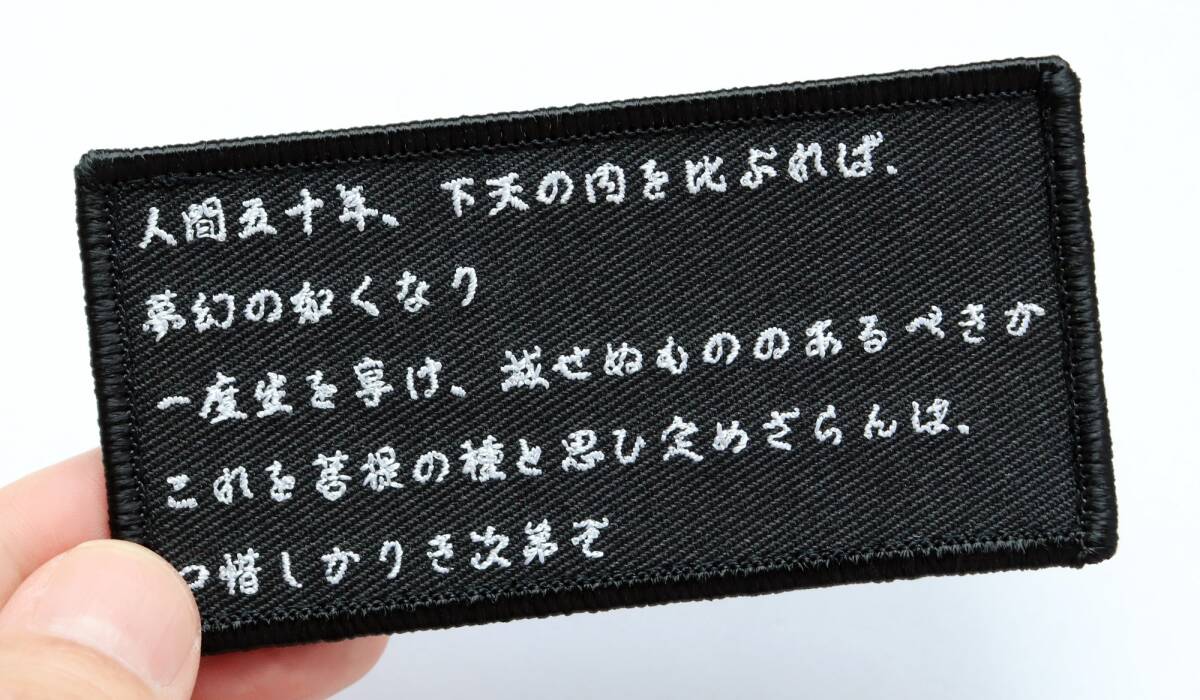 織田信長が好んだ演目「敦盛」の詩章をデザインした刺繍ワッペンです。
