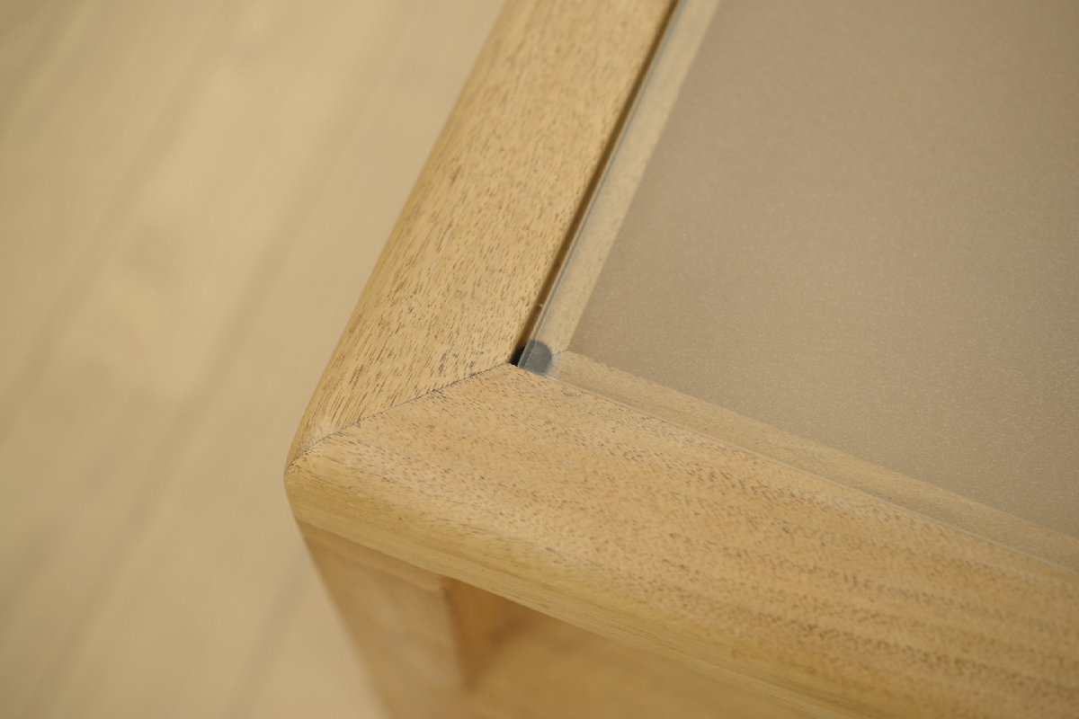 木目をはっきり残した仕上げのウッドフレームは温かみがあり、直角を落としているため柔和な印象。