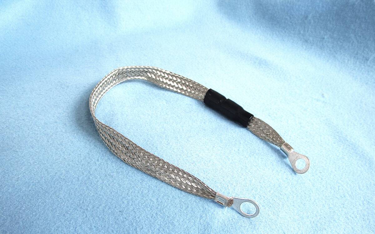 クリプトロン(セラミックス入り)6600円の2倍型アーシング、日本製使用、太目平編みメッキ線(幅16mm):8sq端子サイズ:片側R8-10 反対側R8-8。