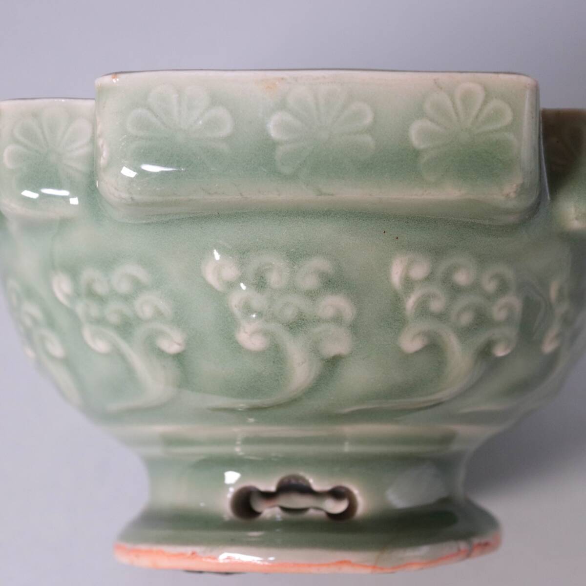 Product name: 江戸時代 三田焼 三田青磁 陽刻 盃洗  四方変形 高台透かし 煎茶道具 古陶磁 F0607C6